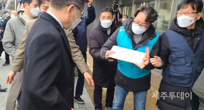 제주칼호텔매각중단을위한도민연대 임기환 상임공동대표와 서승환 서비스연맹 제주관광서비스노조 제주칼호텔지부장 등은 이날 오전 제주4·3평화교육센터 입구에서 제주 정책 발표를 위해 찾은 이재명 후보에게 이같이 건의문을 직접 전달했다.