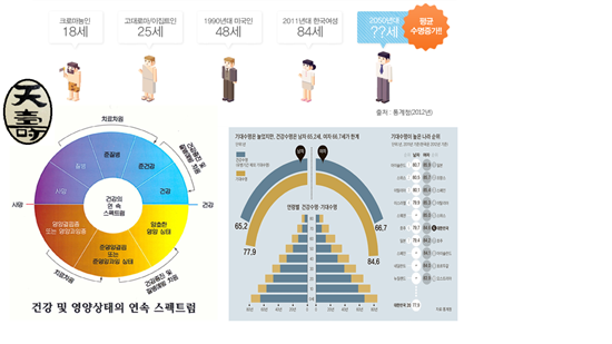 우리의 건강스펙트럼은 일생동안 다섯 단계로 건강(0세∼25세), 준 건강(26세∼45세), 준 질병(46세∼66세). 질병(67세∼81세), 사망(82세∼)로 크게 나눌 수 있고, 우리가 이야기 하는 건강수명은 준 질병까지라고 볼 수 있다.