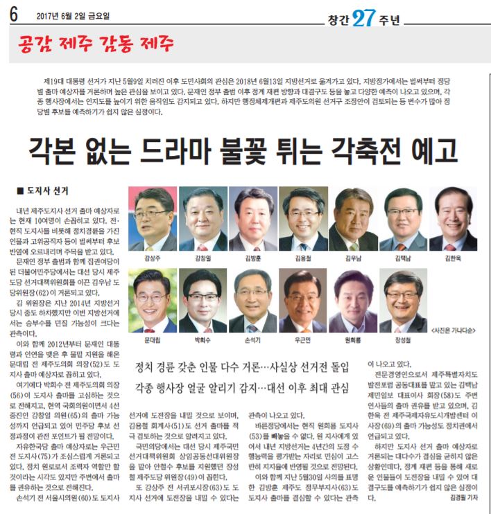 그런데 지난 6월 2일 창간 27주년 기사를 보고는 아연실색했다. 내년 도지사 선거 예비후보를 거론하며 회사 대표를 함께 다룬 것이다. 지방선거가 도민들의 관심거리인 것은 맞다. 자천타천 거론되고 있는 것도 사실이라면 사실이다. 사실을 다룬 것 자체가 무슨 잘못이냐고 반문할 지 모른다. 만약 그렇게 반문한다면 이렇게 되묻고 싶다. 언론사 대표가 도지사 후보로 거론되고 있는 상황 자체가 정상적인 것인가라고.