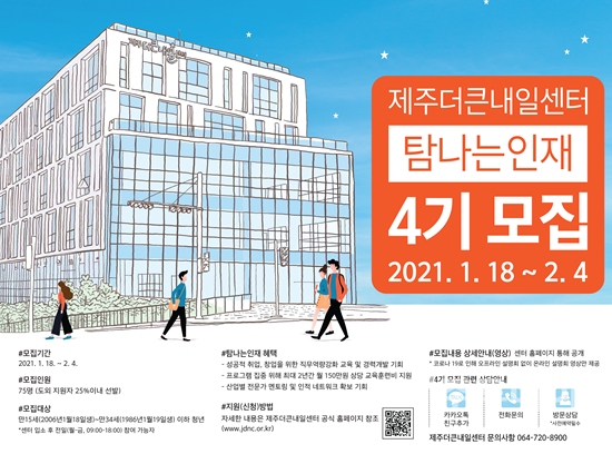 제주더큰내일센터(센터장 김종현)가 오는 2월 4일까지 취·창업 프로그램 참여자 ’탐나는인재‘ 4기를 모집한다고 19일 밝혔다.