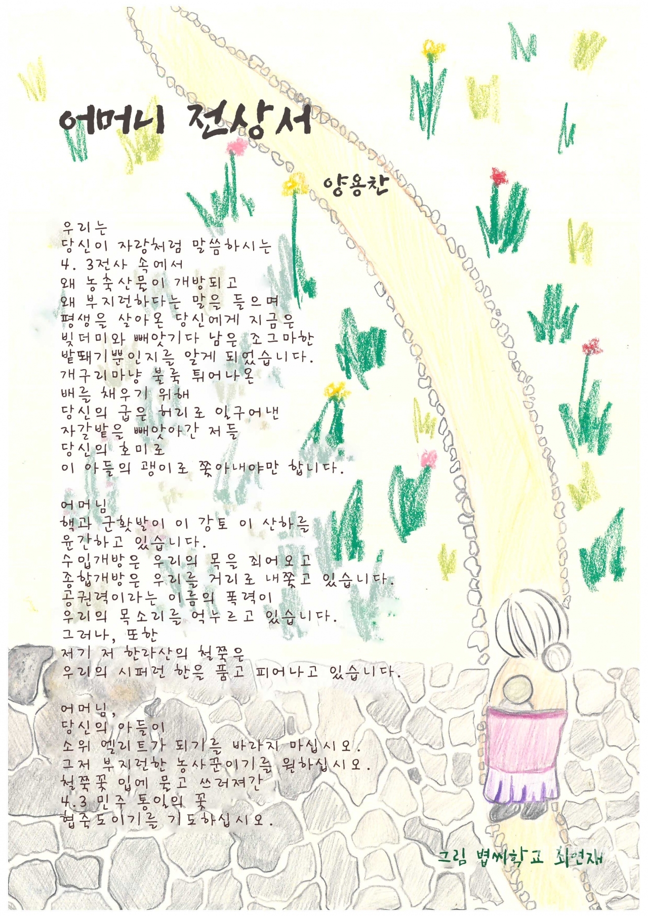 올해는 제주개발 악법 철폐를 외치며 분신 산화한 양용찬 열사 30주기입니다. 민중사랑 제주사랑 양용찬열사추모사업회와 제주투데이, 볍씨학교가 함께 그를 기억하기 위한 온라인 시화전을 마련했습니다. 여전한 개발광풍 시대, 추모를 넘어 양용찬 열사의 외침이 제주사회 곳곳에 기억되기를 바라며 제주작가들의 추모시를 볍씨학교 친구들의 그림에 담았습니다. 더불어 볍씨 친구들이 자발적으로 보내온 '양용찬 열사 정신 계승 볍씨학교 선언문'까지 도민들과 함께 나누고자 합니다. <편집자주>