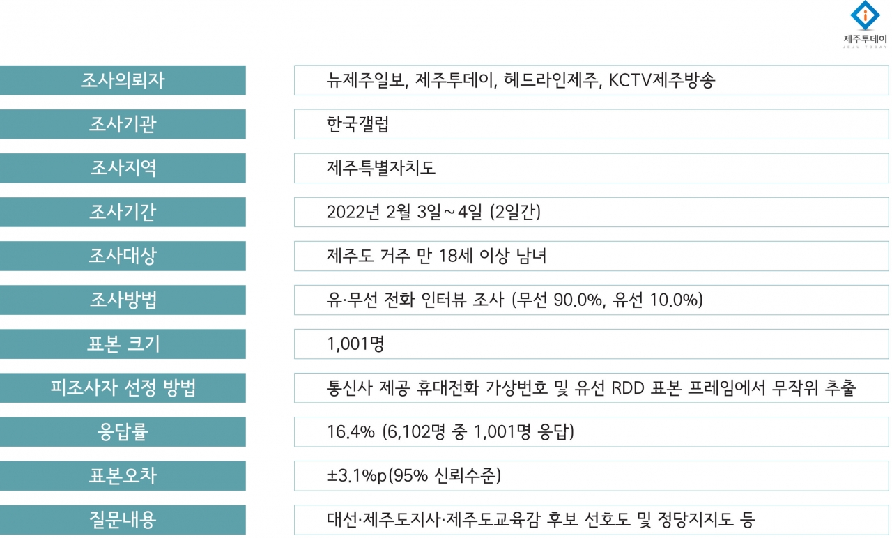 제주투데이와 KCTV제주방송, 뉴제주일보, 헤드라인제주가 공동으로 여론조사전문기관 한국갤럽에 의뢰해 지난 3~4일 이틀간 만 18세 이상 제주도민 1001명을 대상으로 조사한 도지사 후보 선호도 여론조사 결과가 7일 발표됐다.