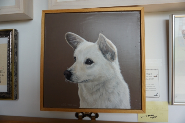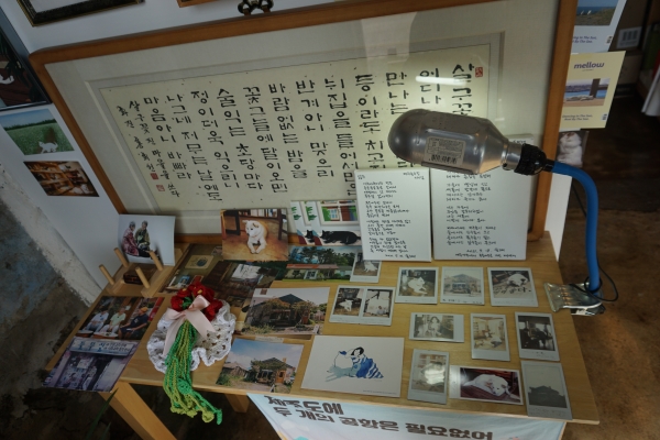 제주를 소재로 한 책들을 위한 코너와 독립출판물도 있어서 인문사회과학 책이 아니더라도 선택의 폭이 넓다. 아무래도 주요 고객이 관광객이다 보니 그들의 선호에 맞춘 책 역시 두루 갖춘 것이다. 그리고, 한켠에는 하얀 강아지의 그림과 사진 등이 진열돼 있다. 이곳의 인기스타이자 영업부장인 반려견 ‘광복이’ 코너다.