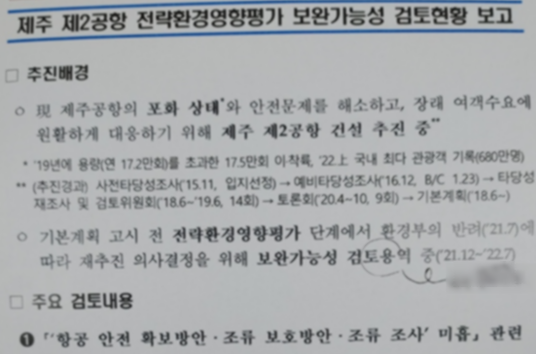그럼에도 국토부는 지역 주민, 제주도와 소통없이 용역 내용을 전제로 사실상 전략환경영향평가서 재작성을 위한 작업들을 이미 진행하고 있는 상황이다.