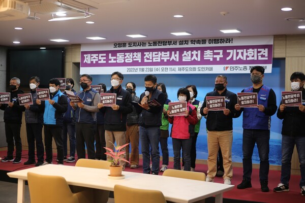 또 "지난 6월 28일 제주도지사직 인수위원회 또한 민선 8기 101개 도정 과제 중 '노동권 보장강화를 통한 노동 존중 실현' 과제의 첫 번째 목표로 '노동정책 전담부서 설치를 통한 노동 존중 정책 실현 토대 마련'을 약속한 바 있다"고 덧붙였다.