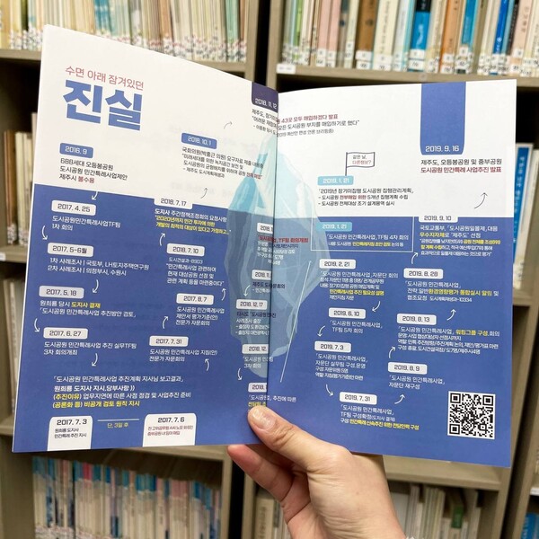 “제가 도시공원위원회 위원을 한 4년 동안 했었요. 한창 도시공원 민간 특례를 한다, 만다 얘기가 나올 때였어요. 근데 그때 2019년도에 안 한다고 기사가 나왔는데 내부 회의를 하는데 무슨 자문을 한다고 하면서 할 수도 있다고 얘기를 하는 거예요. 그래서 제가 되게 노발대발 화를 냈거든요. 그러면서 이렇게 제주도가 기만적으로 했다는 것을 도민에게 제대로 보여줄 필요가 있다고 생각을 했어요. 정말 죽어라 정보 공개 청구를 했고요. 저 자료를 찾아서 제주도의 모순된 행정의 민낯을 보여주자, 해서 만들게 됐어요.” -박유라 사무국장