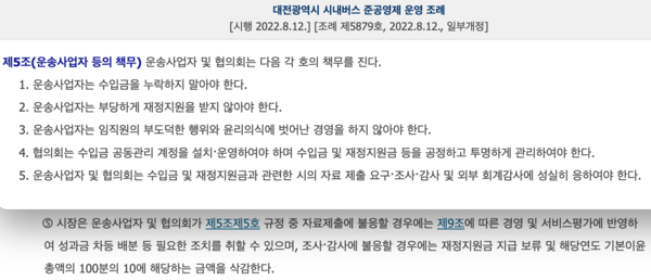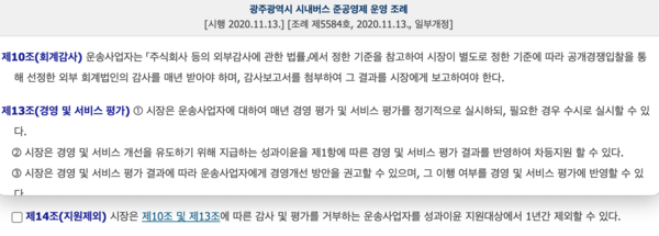 먼저 광주광역시. 광주광역시는 “감사 및 평가를 거부하는 운송사업자를 성과이윤 지원대상에서 1년간 제외할 수 있다”고 관련 조례에 명시하고 있다.