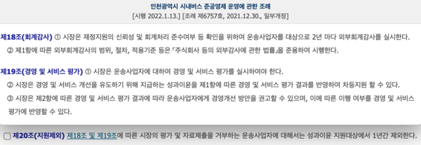 실제 제주도 버스 준공영제 운영에 관한 조례를 들여다 보면 제19조에 다음과 같이 외부 회계 감사 의무가 명시돼 있다.