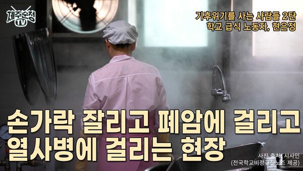 기후위기를 온몸으로 맞으며 극한 노동을 하고 있는 급식실 노동자들의 이야기. 환기 안되는 급식실에서 열사병에 걸리고 기름으로 튀기고 볶을 때 나오는 1급 발암물질 조리흄에 노출되며 11명의 조리실무사가 1300명 분의 식사를 준비하는 급식실은 안전한가? -제주순정TV