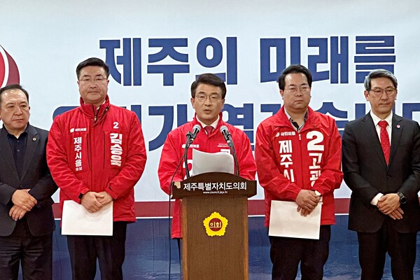 국민의힘 고광철(제주시갑)·김승욱(제주시을)·고기철(서귀포시) 후보는 22일 제주도의회 도민카페에서 기자회견을 열고 이같이 촉구했다. 이날 회견에는 같은당 소속 도의원 전원이 참석했다.