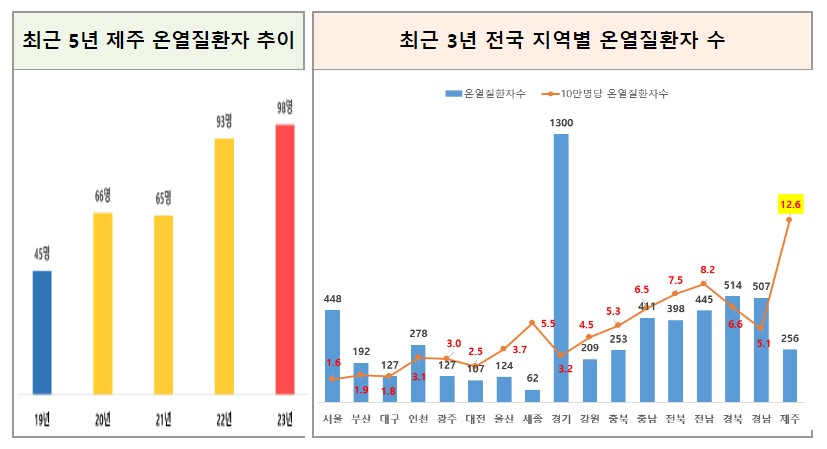 특히 지난해에는 제주지역 인구 10만명 당 14.5명이 온열 질환을 앓아 전국에서 가장 높은 수치를 기록했다. 실외작업이 많은 농·어업인 종사자가 25%정도를 차지하여 가장 많고, 연령별로는 50대가 가장 많이 발생한다.