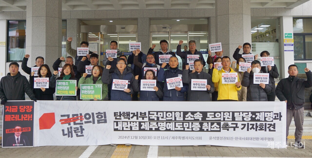 윤석열정권퇴진·한국사회대전환 제주행동은 10일 오전 제주도의회 앞에서 기자회견을 열고 “탄핵거부 국민의힘 소속 도의원의 탈당·제명과 내란범들의 제주명예도민증을 취소하라”고 촉구했다.