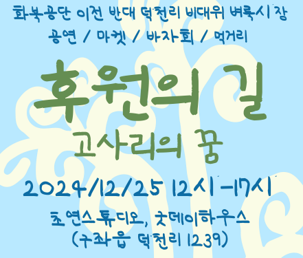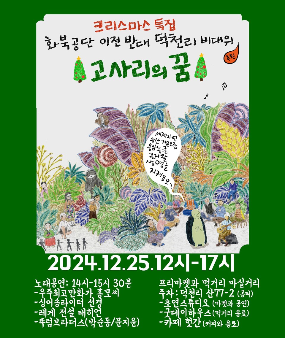 화북공업단지 이번 반대 덕천리 비상대책위원회(이하 비대위)는 오는 25일 오후 12시부터 오후 5시까지 덕천리 산 일원에서 ‘크리스마스 특집 화북공단 이전 반대 덕천리 비대위 고사리의 꿈’을 개최한다고 23일 밝혔다.