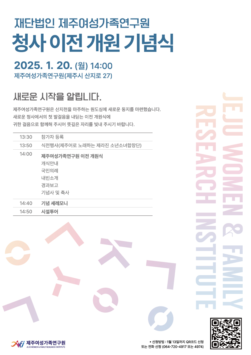 재단법인 제주여성가족연구원(원장 문순덕)은 오는 20일 오후 2시 연구원 신청사에서 이전개원식을 개최한다고 16일 밝혔다.