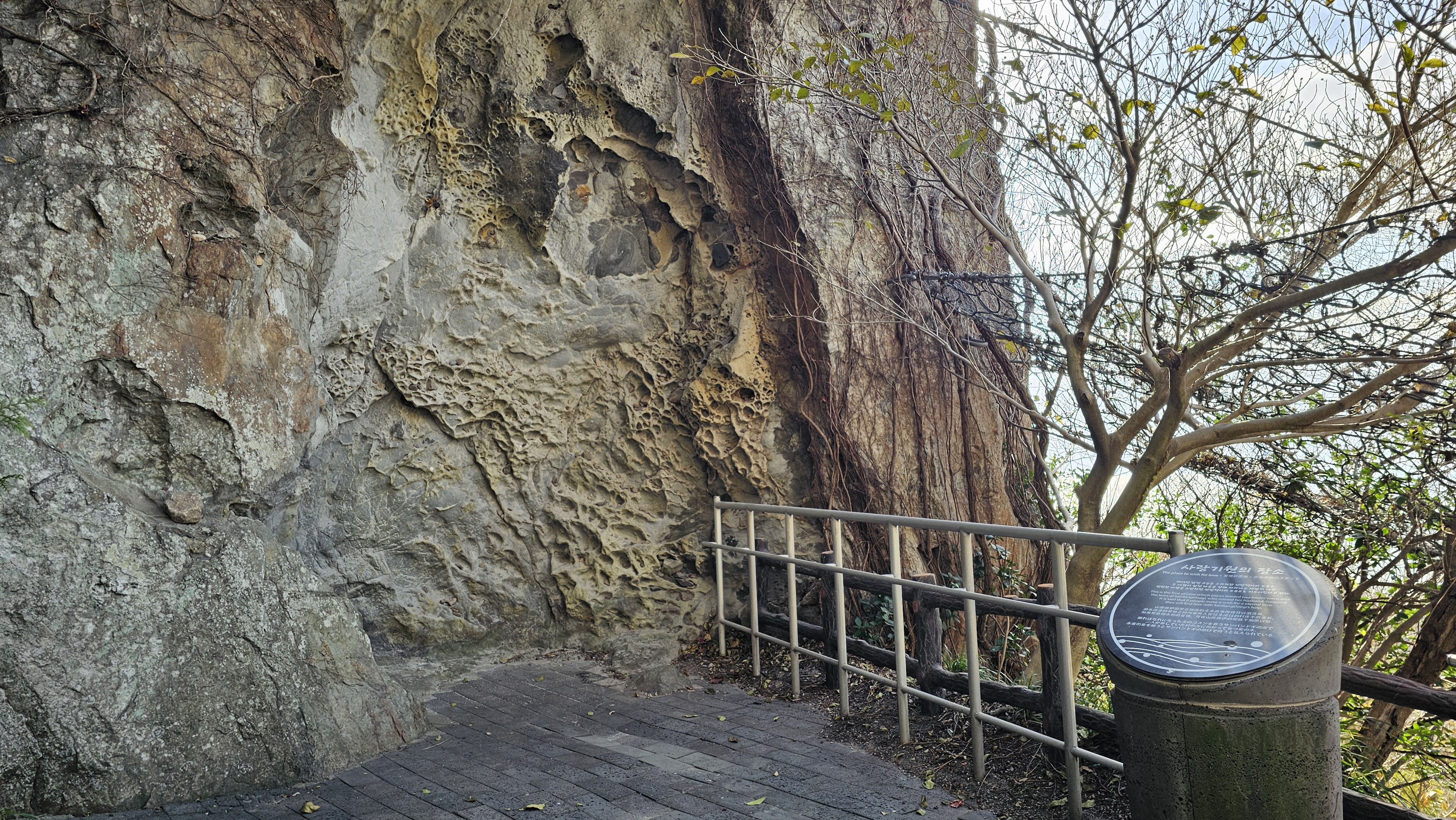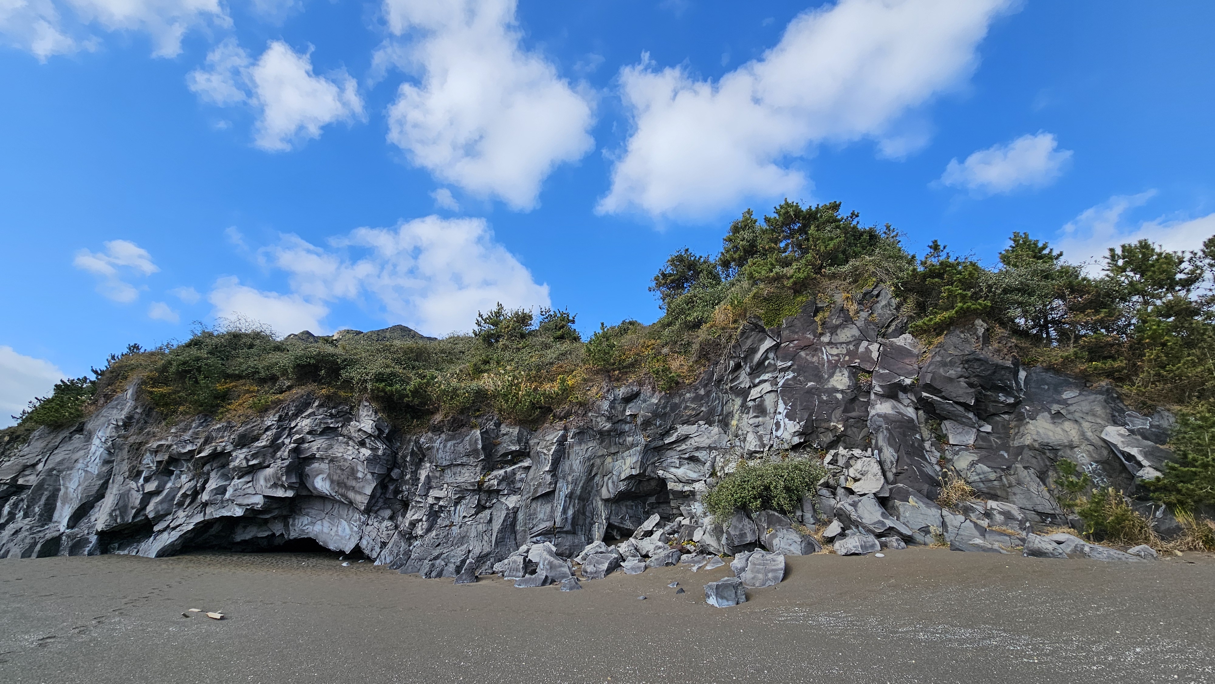 모래사장 위에 위치해 있고 응회암으로 이루어진 절벽과