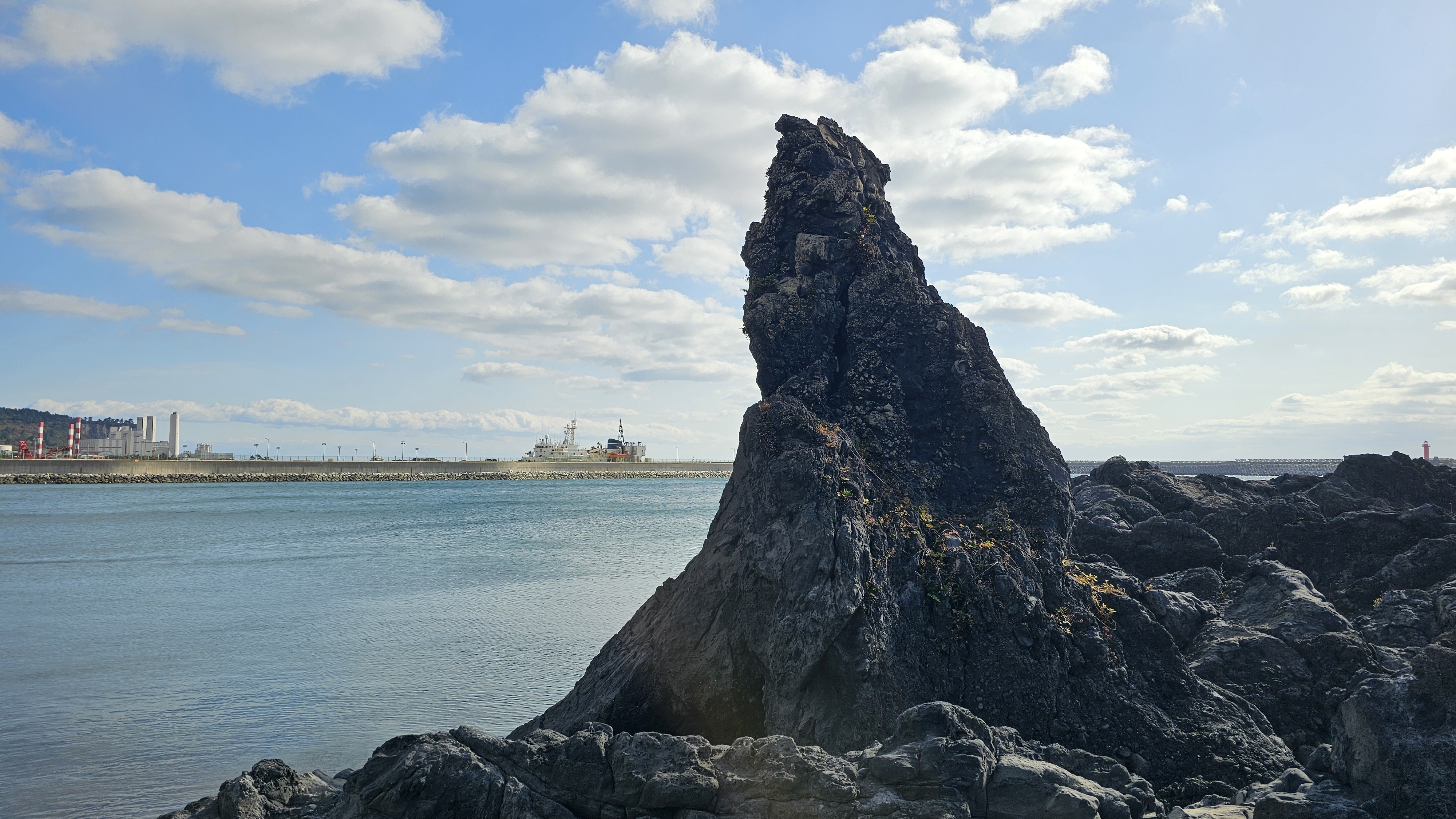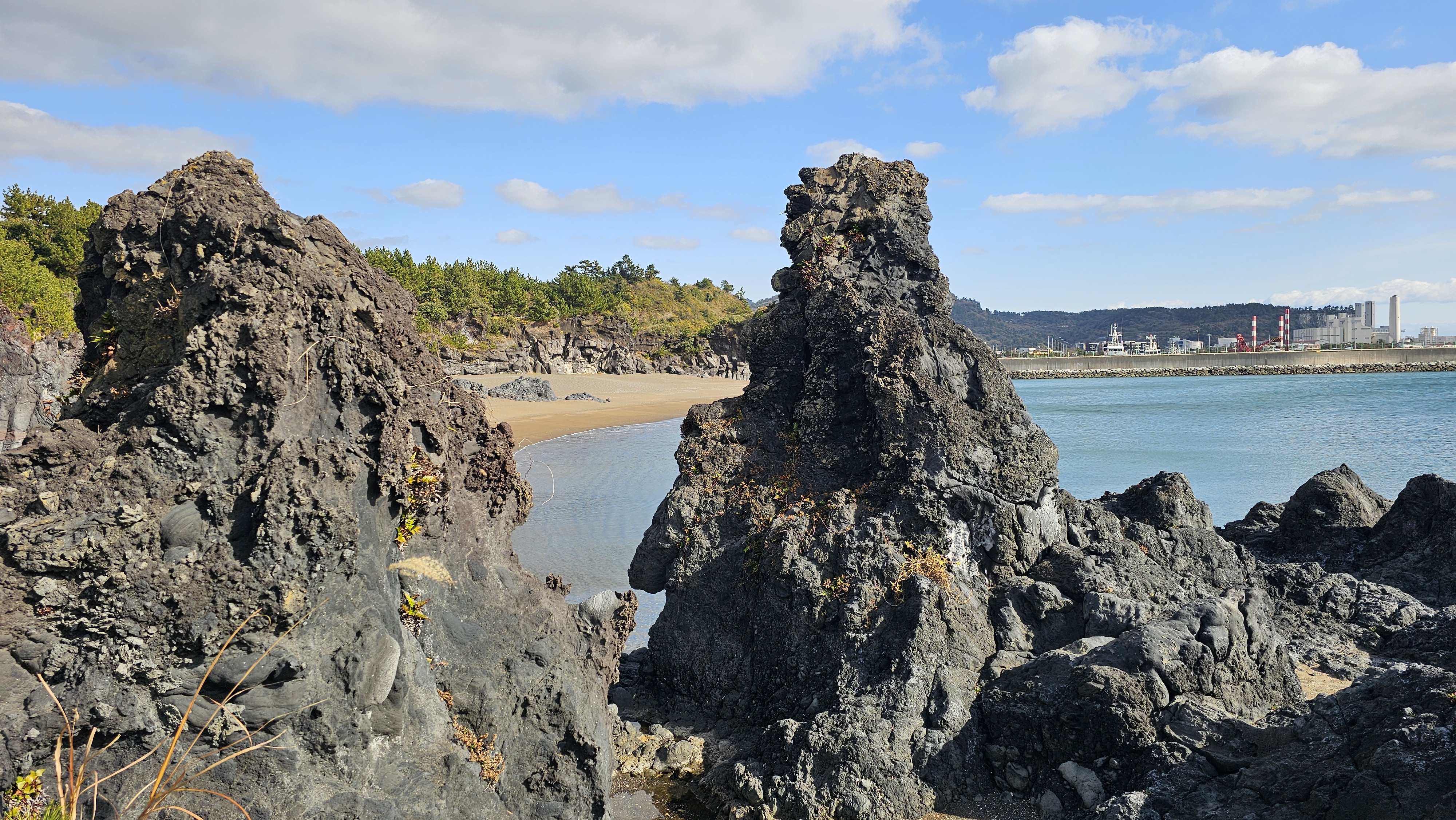거대한 암반이 바닷가를 자리 잡은 해변 전체가 화산암반인 숨은 바다 '황우치해변'