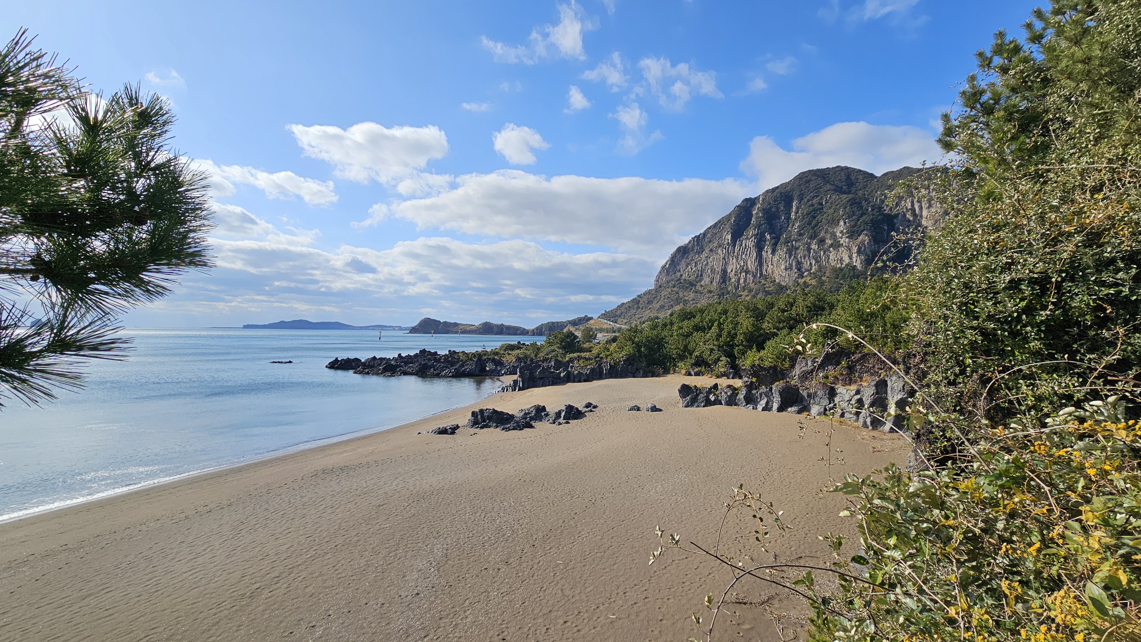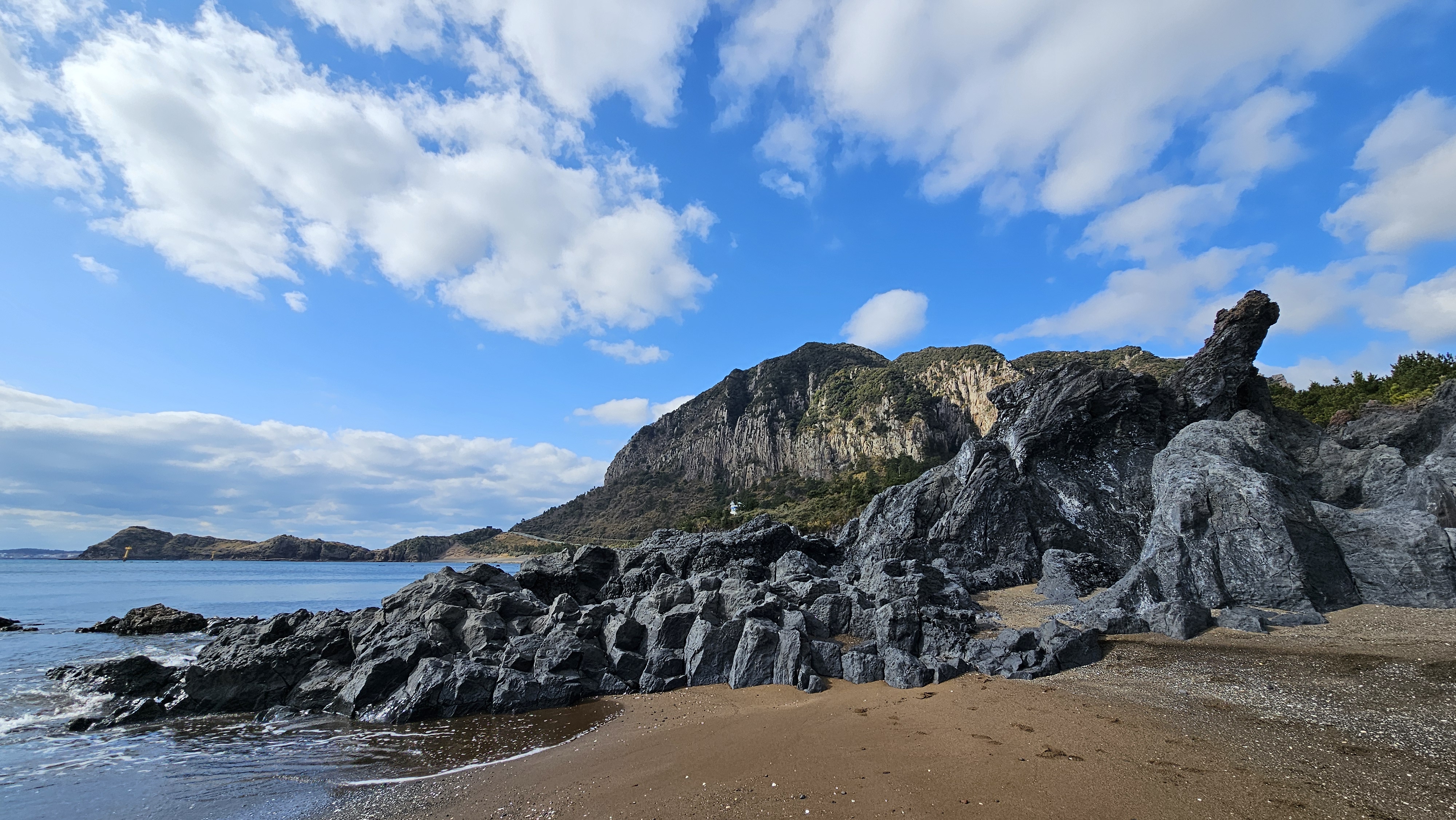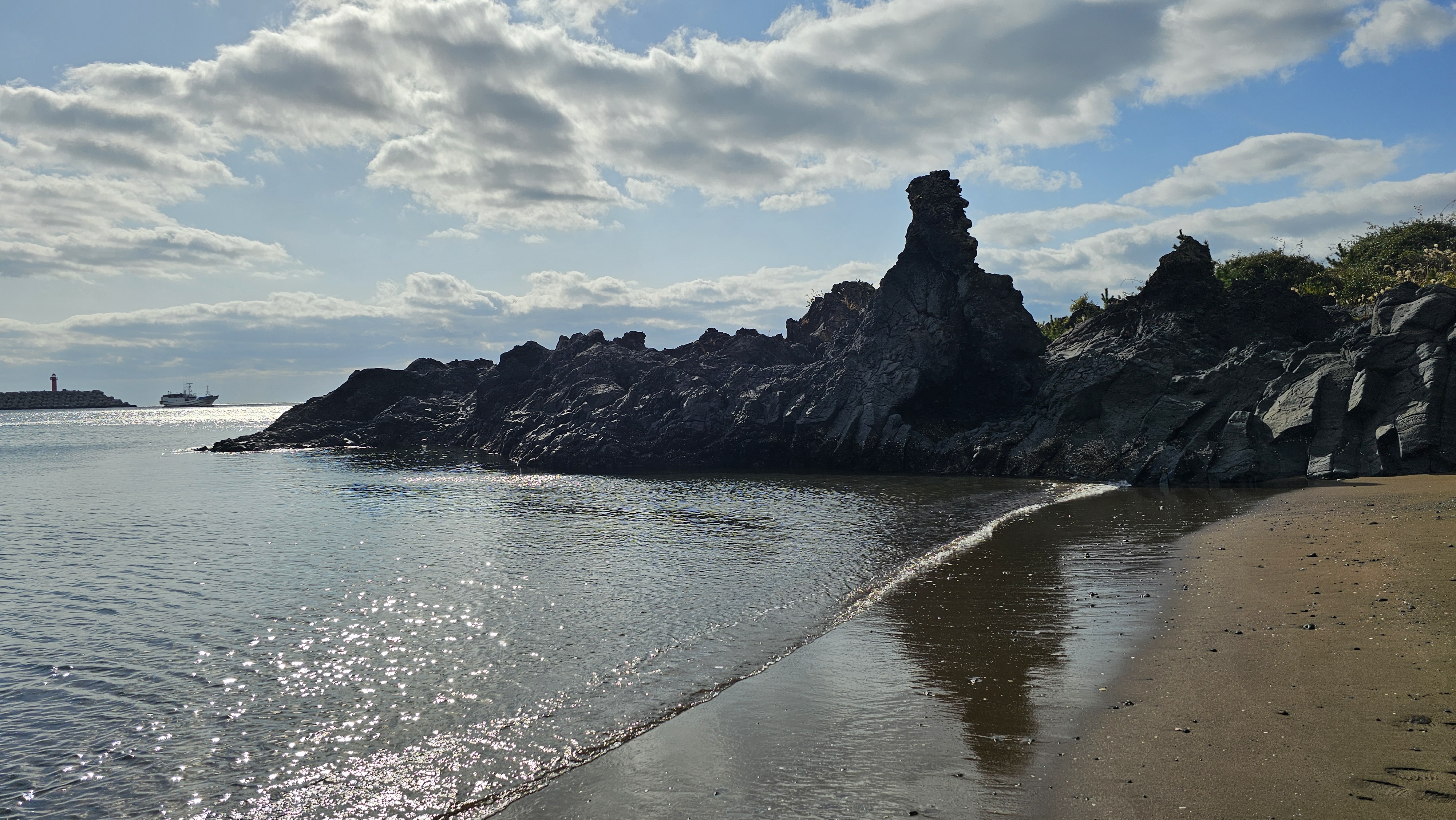 산 아래쪽은 모래밭이지만 바다와 맞닿은 해안은 해안암석 그 자체만으로도 빛이 난다.