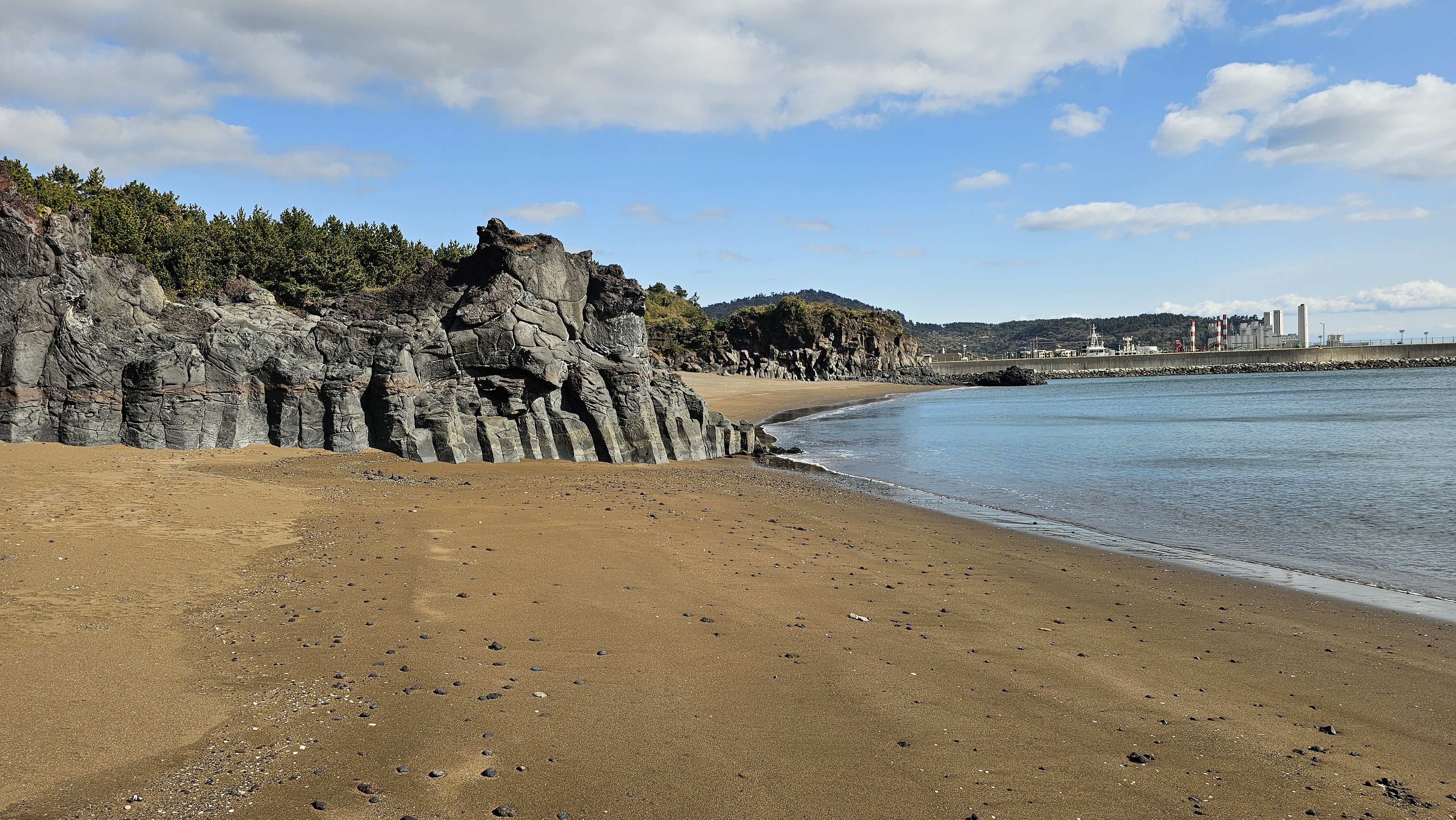 검은 모래사장이 드넓게 형성되어 용머리해안과 기암절벽은