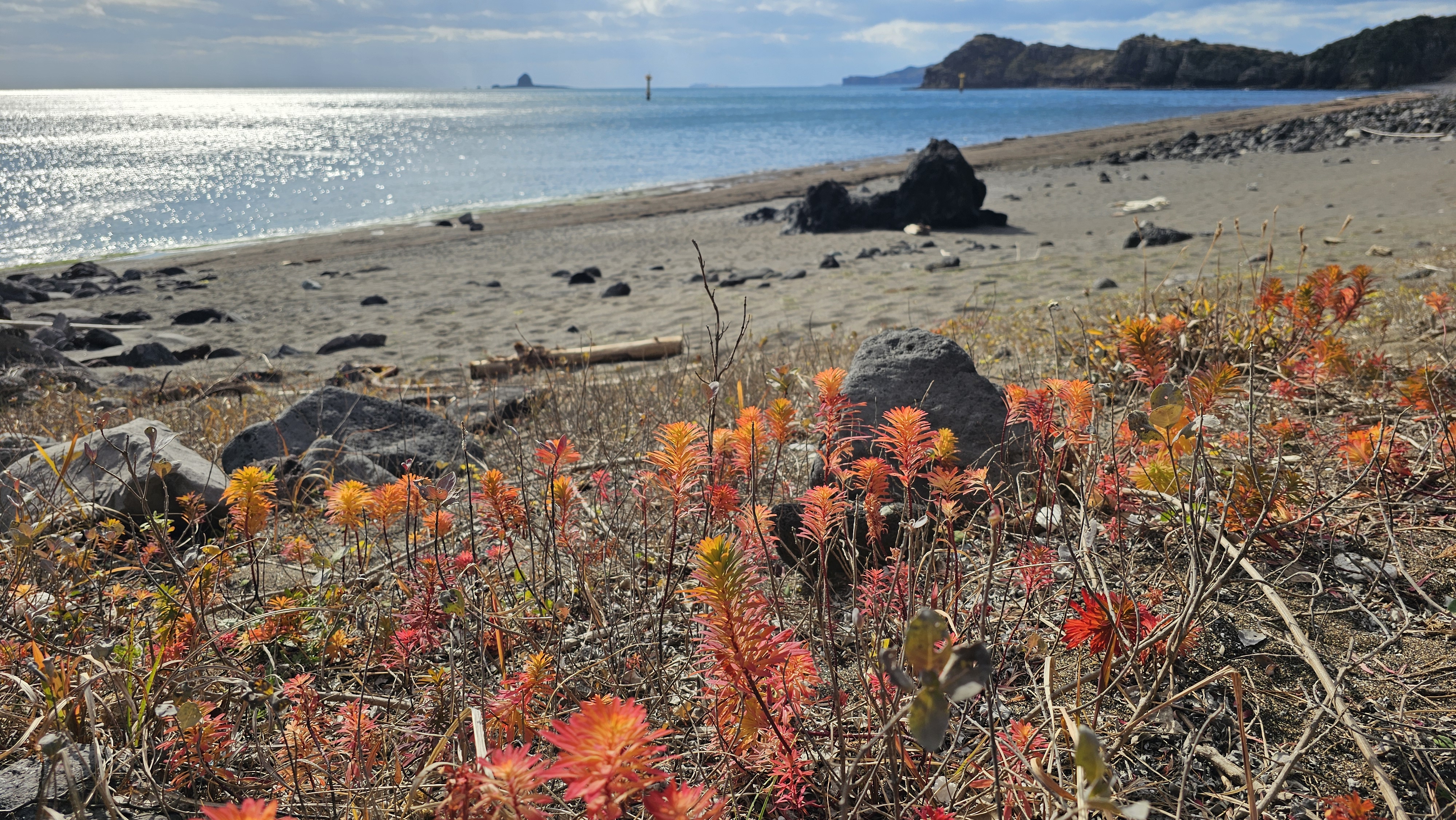 모래 언덕에 군락을 이룬 알록달록 단풍으로 물든 '흰대극'