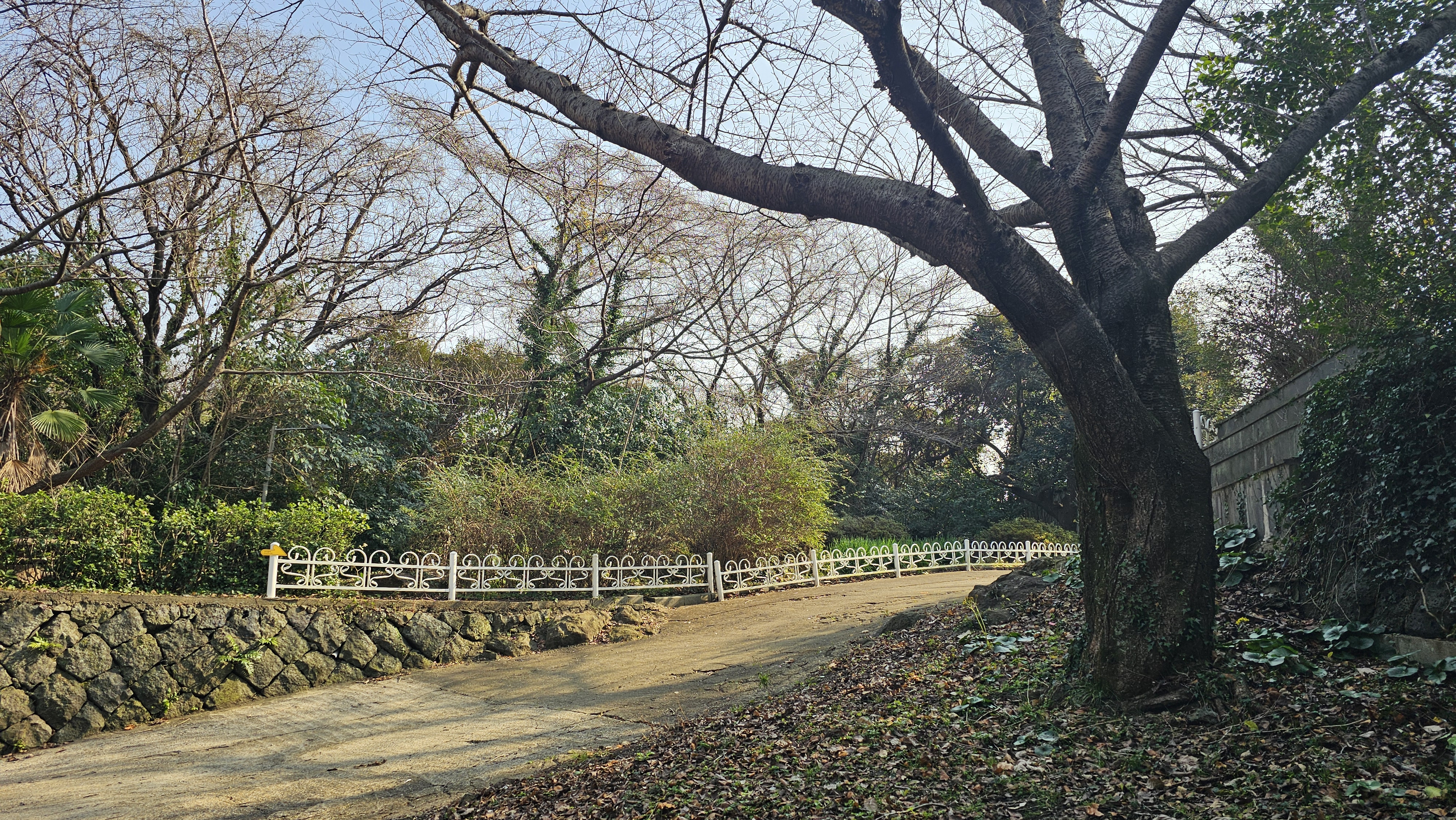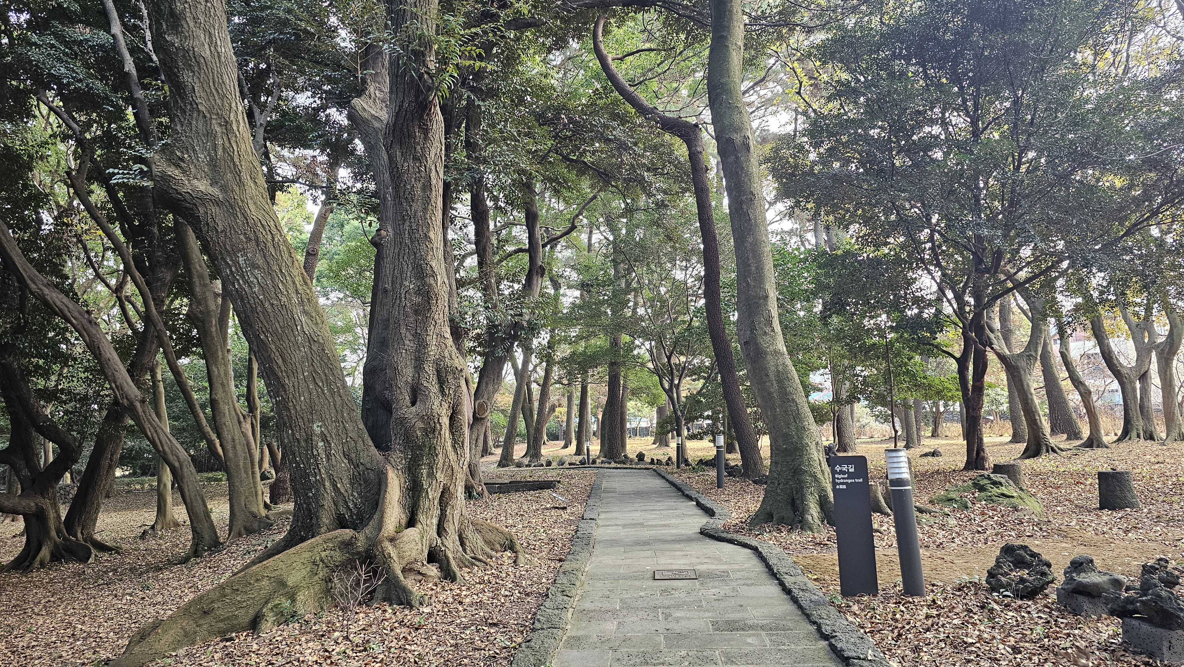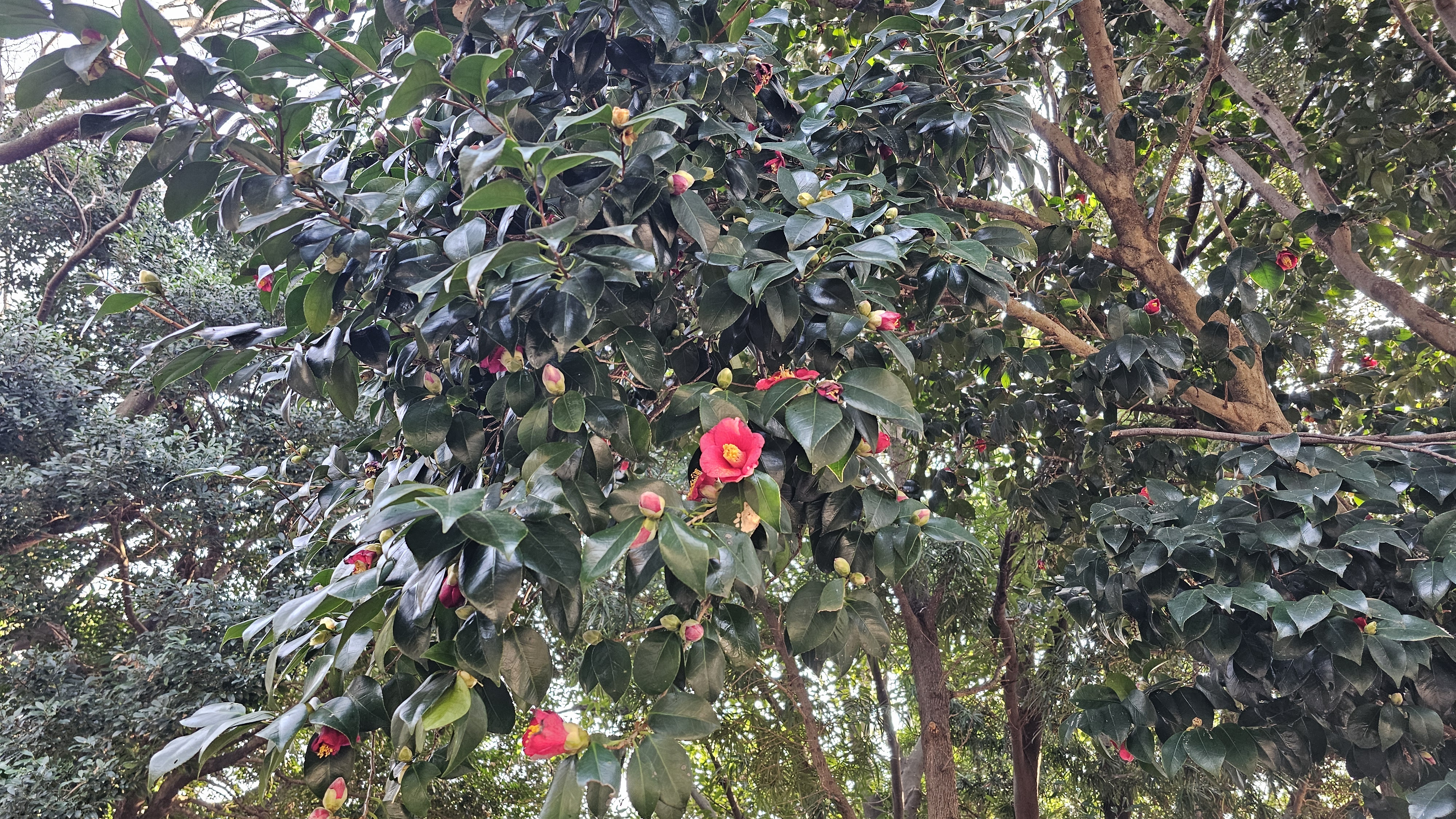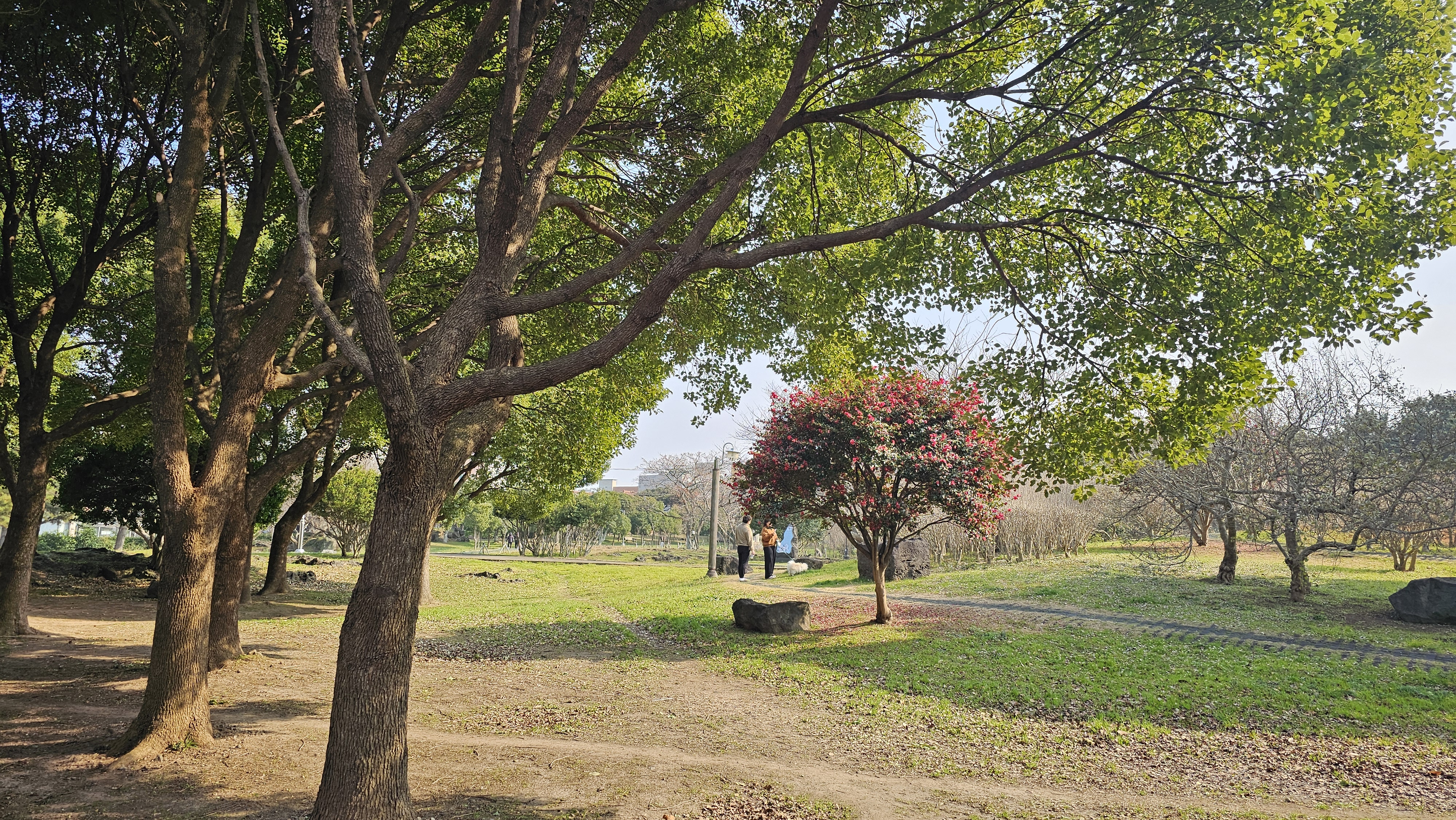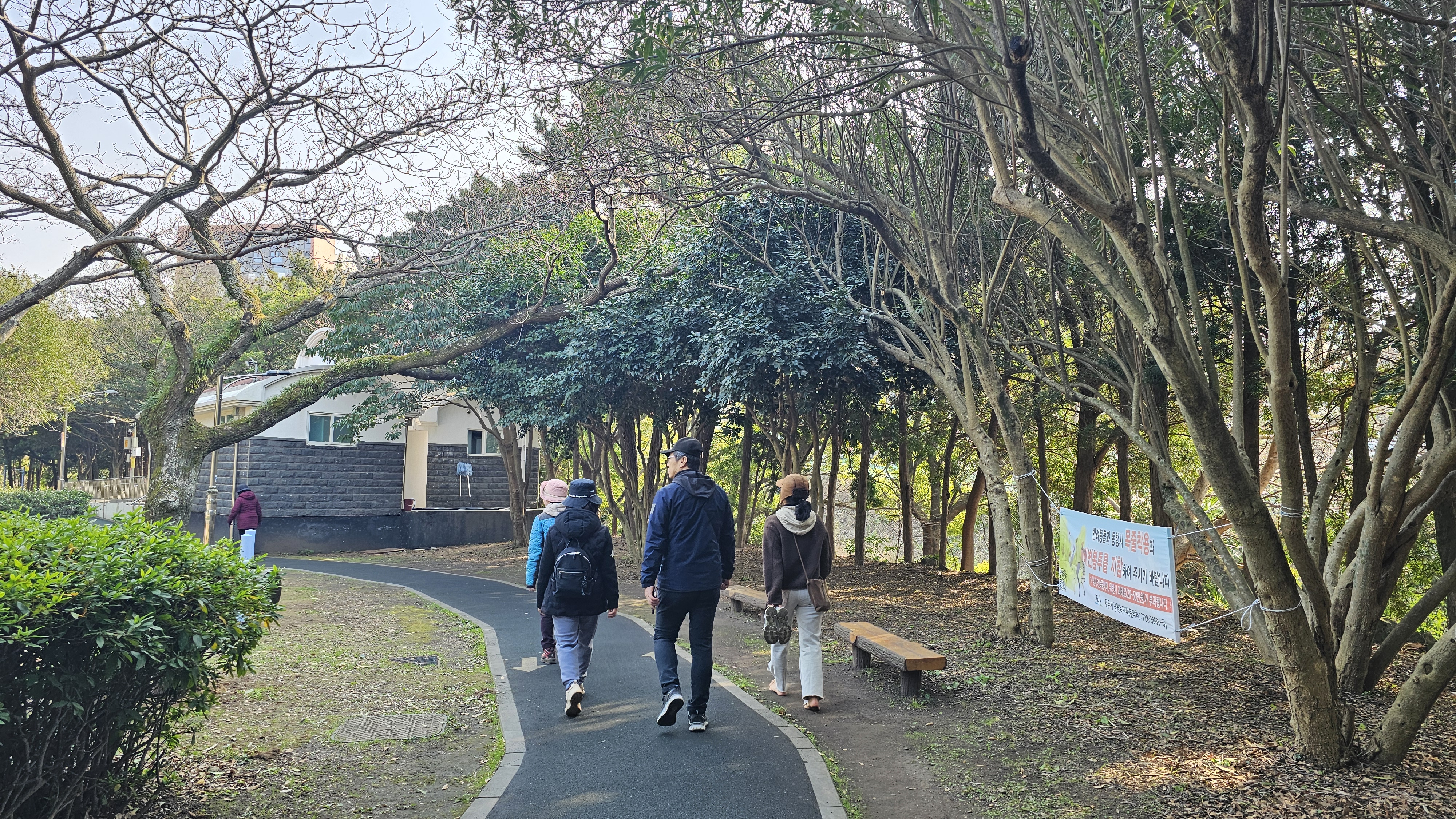 애기동백나무를 비롯한 아름드리나무들과 여유롭게 산책하는 사람들~