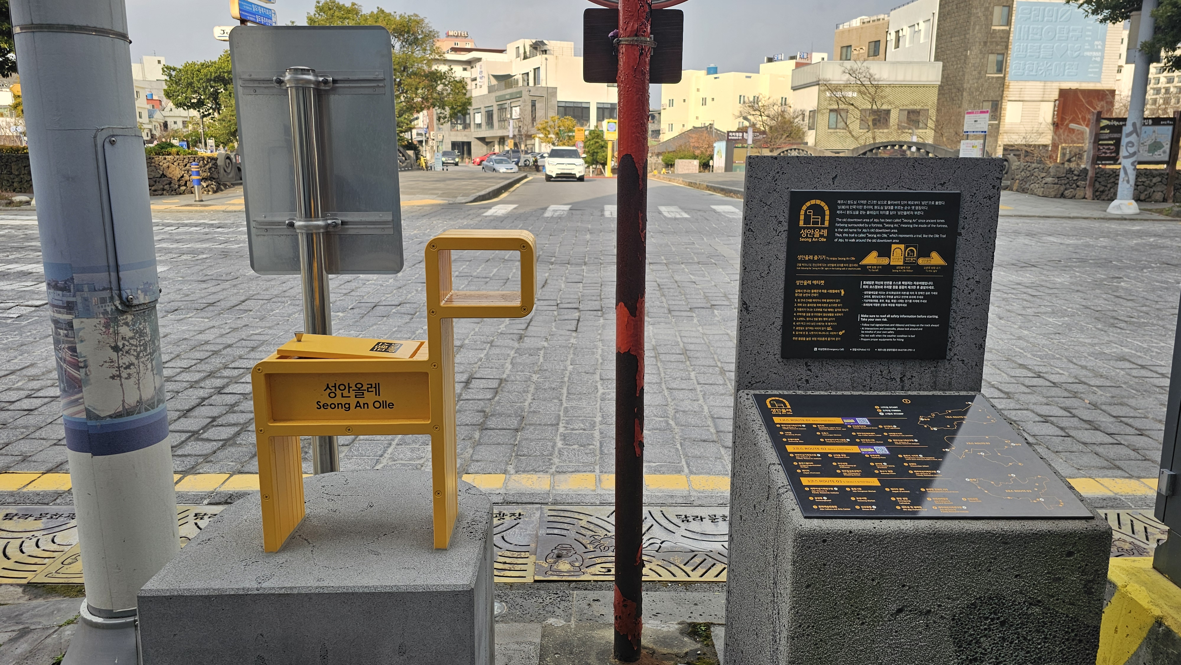 표지석에는 3개의 성안올레 코스 노선을 알리는 내용이 표시되어 있다.
