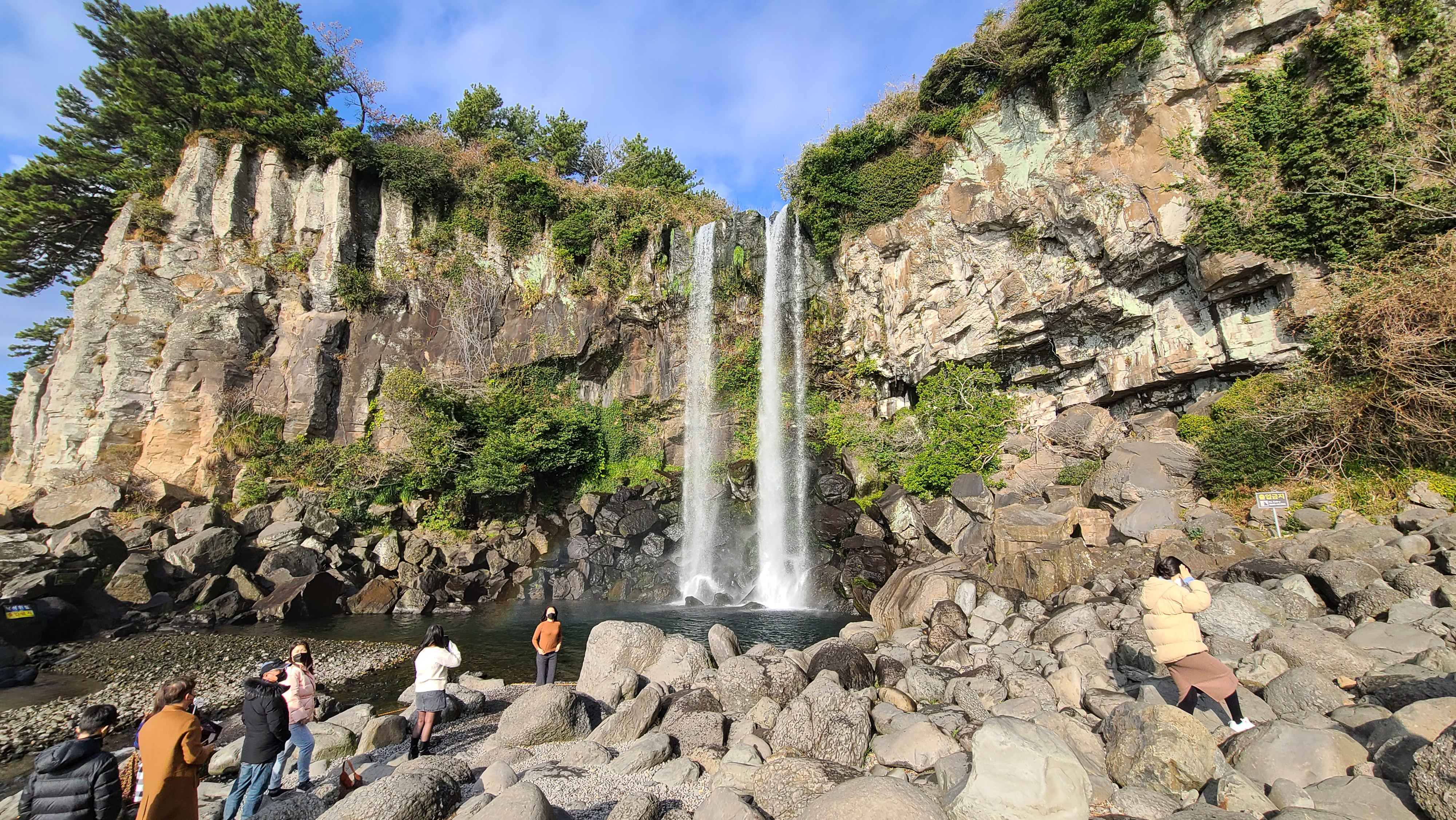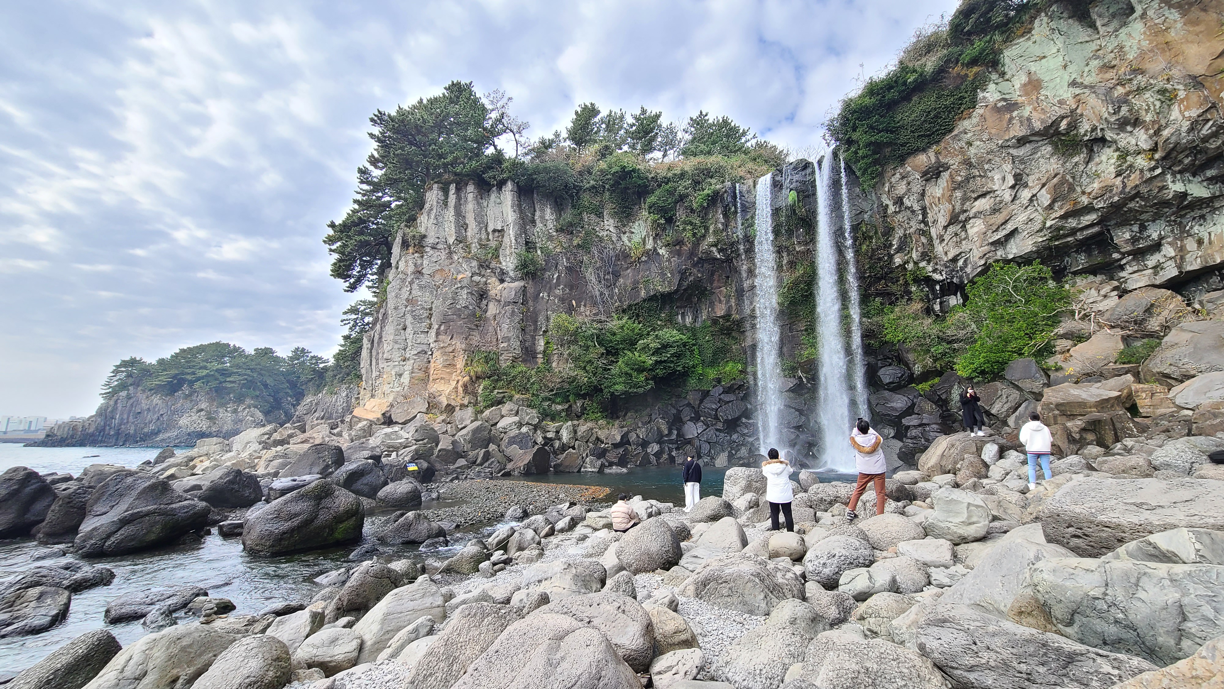 정방폭포의 시원한 물줄기와 쏟아져 내리는 웅장한 폭포의 굉음