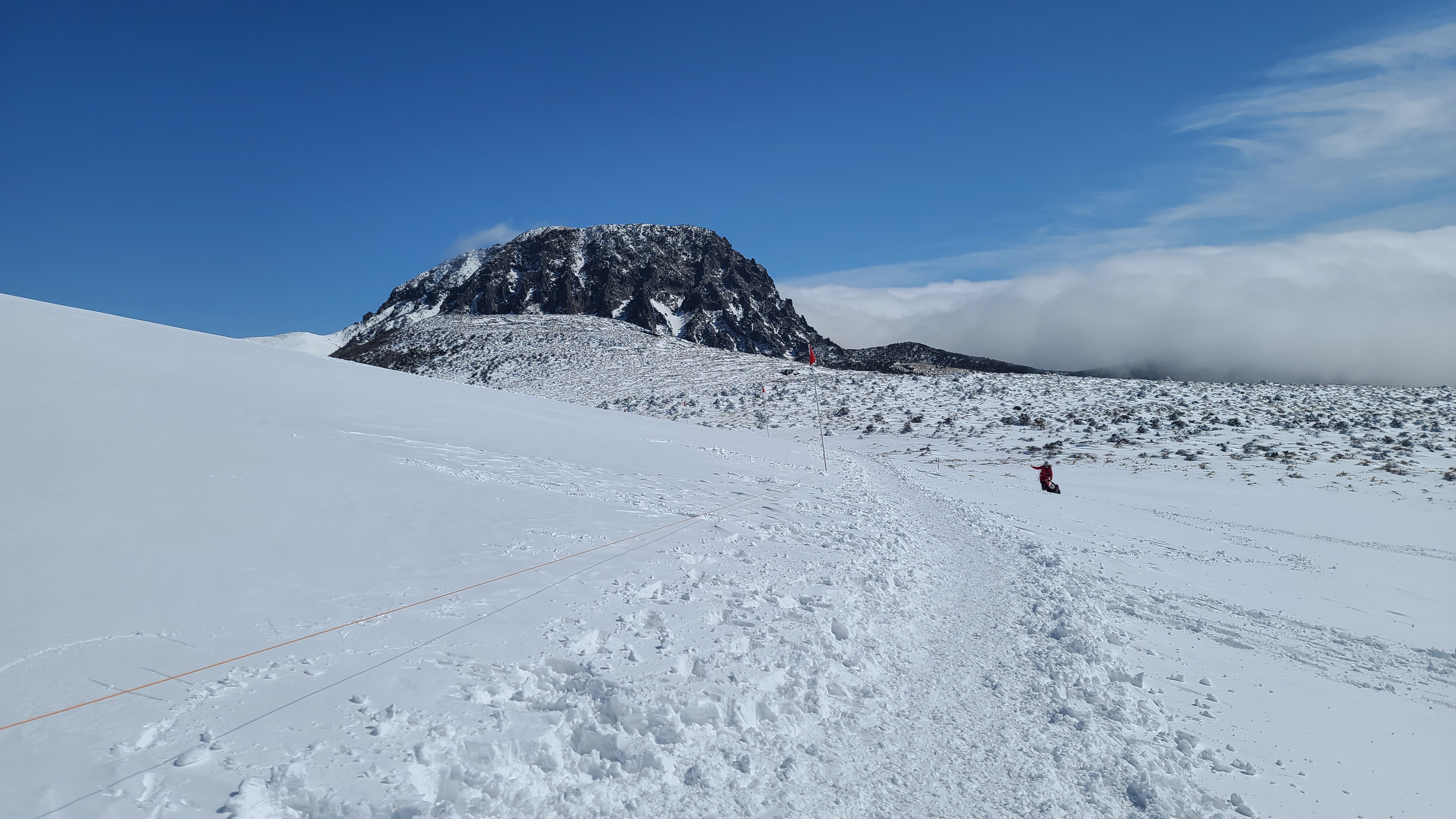 백록담은 성판악 코스나 관음사 코스를 통해서 오를 수 있다.
