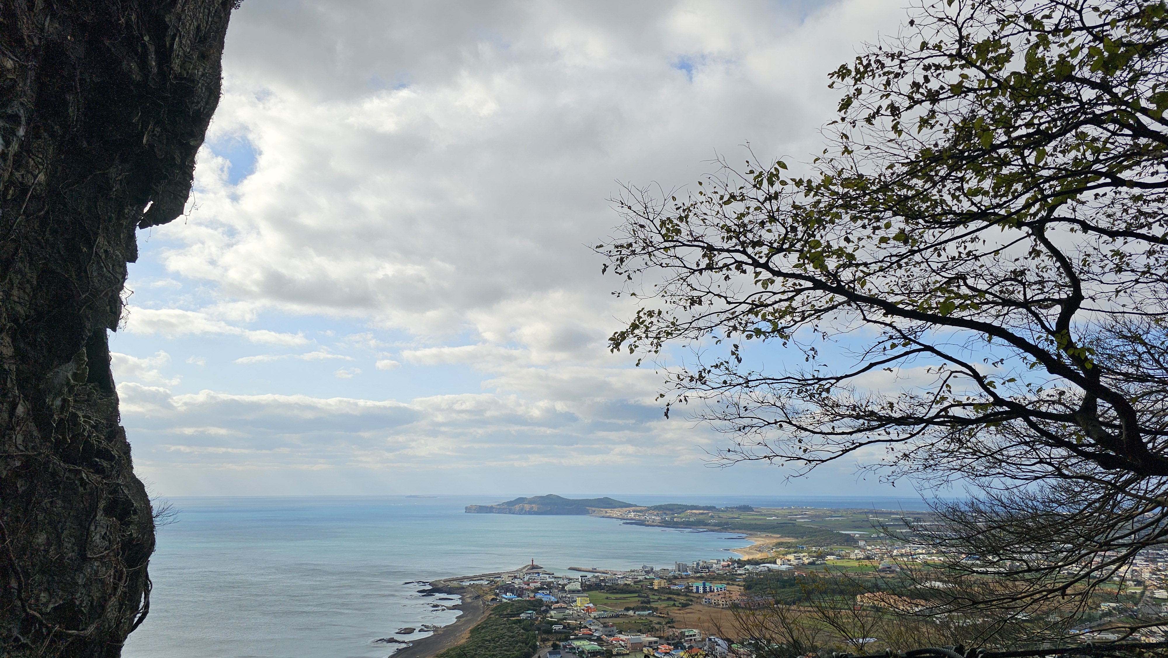 정상에 서면 남쪽으로 웅장한 한라산과 북쪽으로 푸른바다가 눈앞에 펼쳐진다.