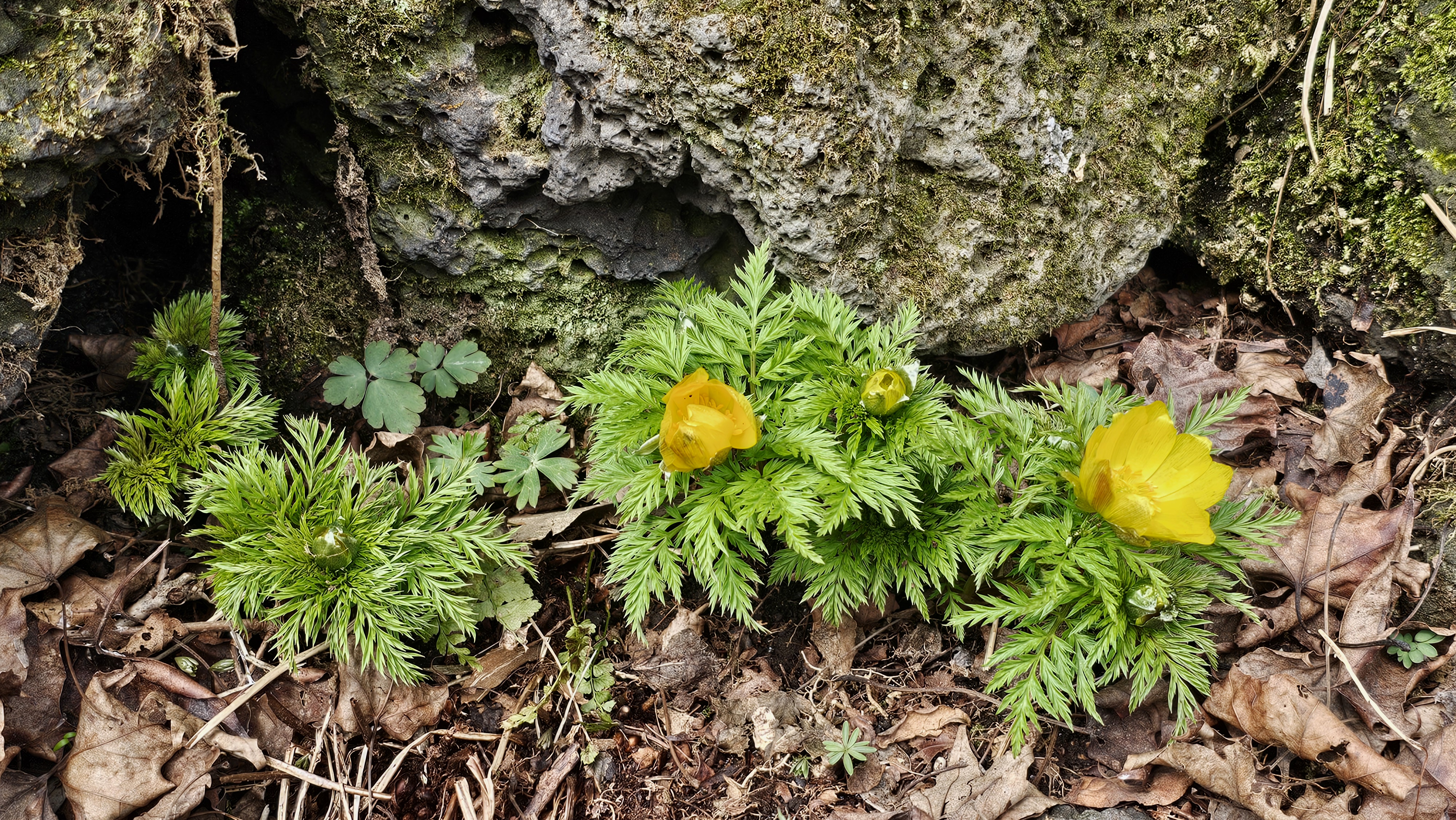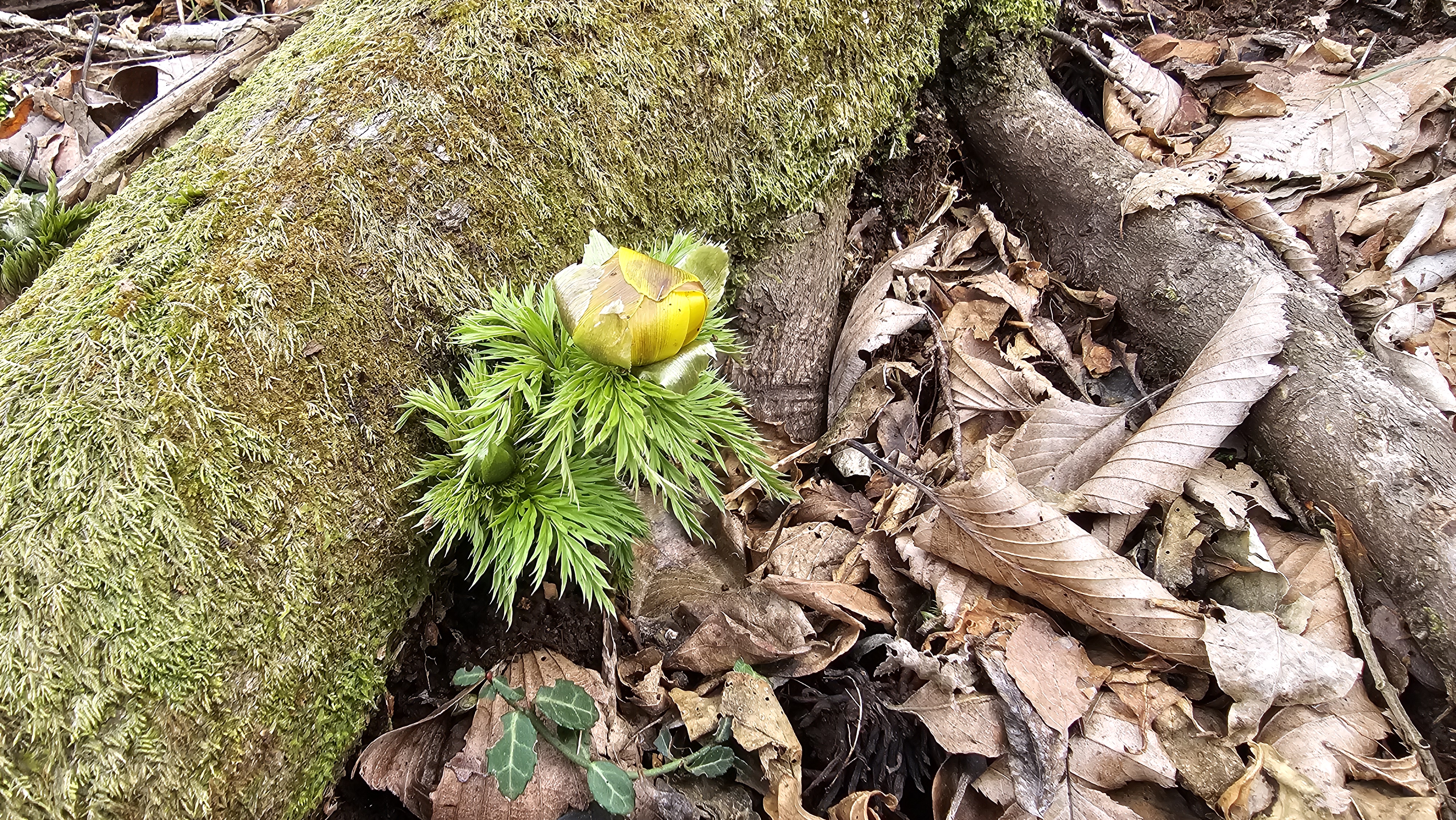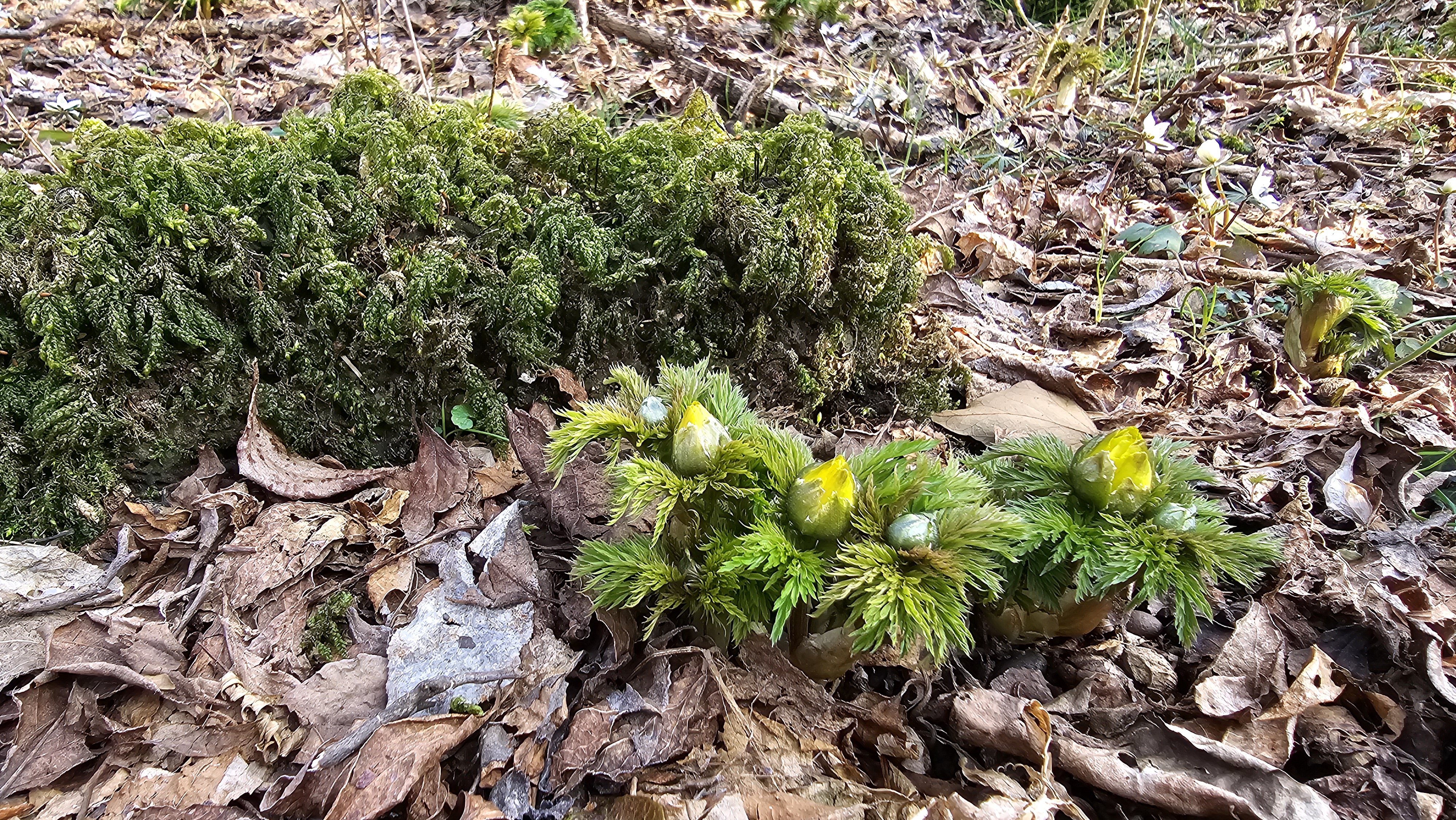 숲 속 나무들이 초록색을 감췄기에 세복수초의 샛노란 색감이 도드라진다.