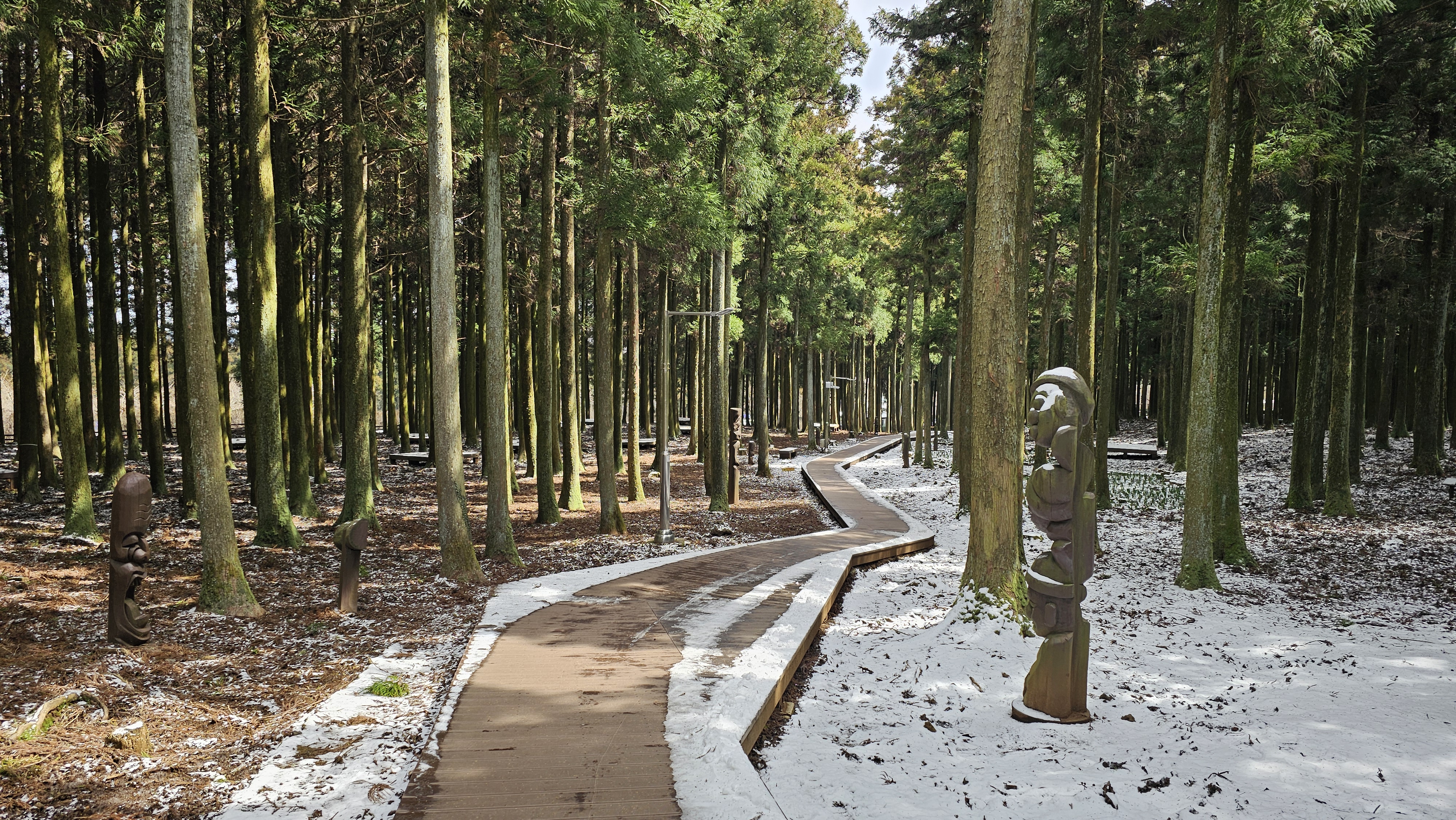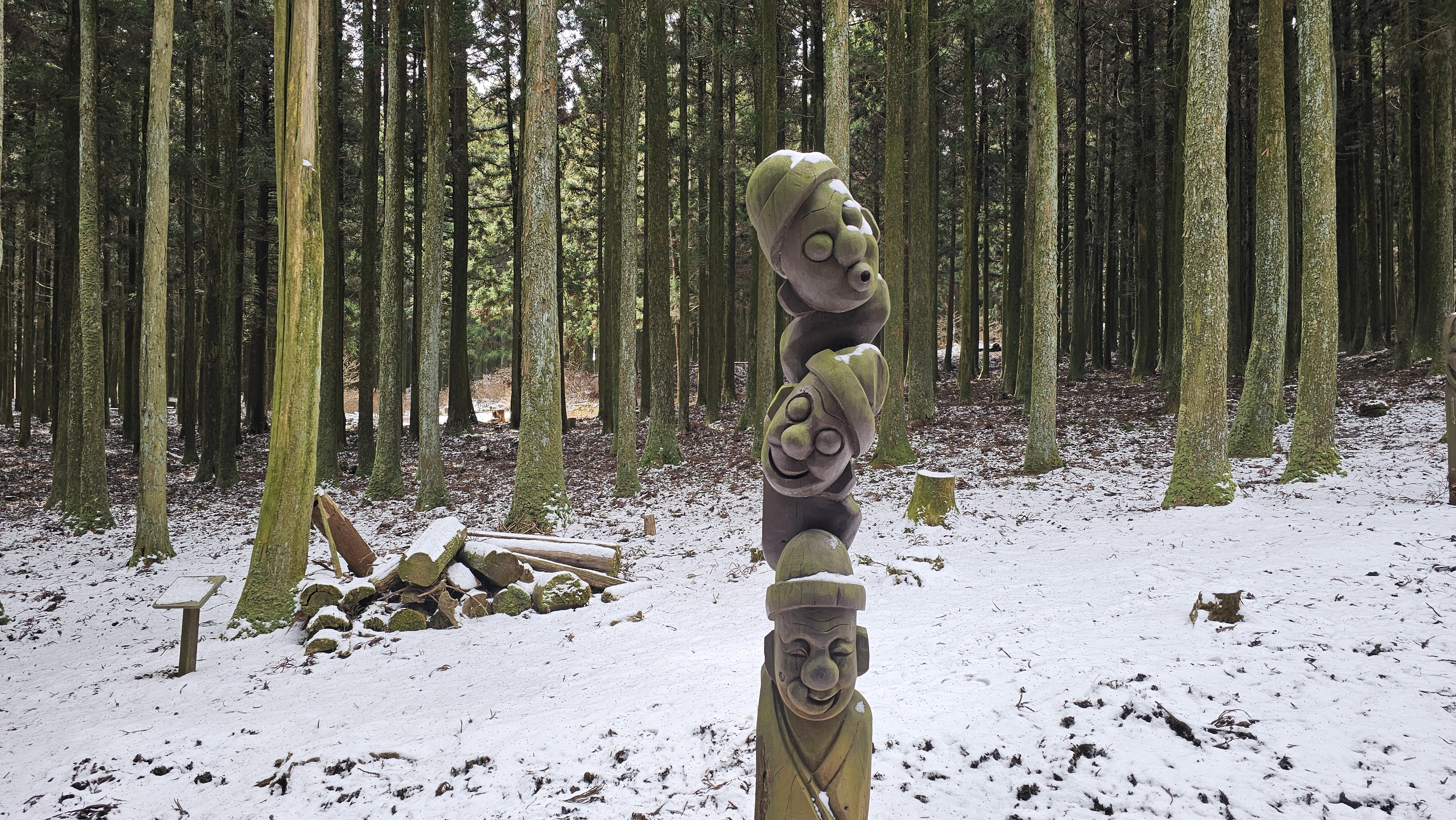 강풍으로 쓰러진 나무로 만든 장승들이 크게 웃어주고