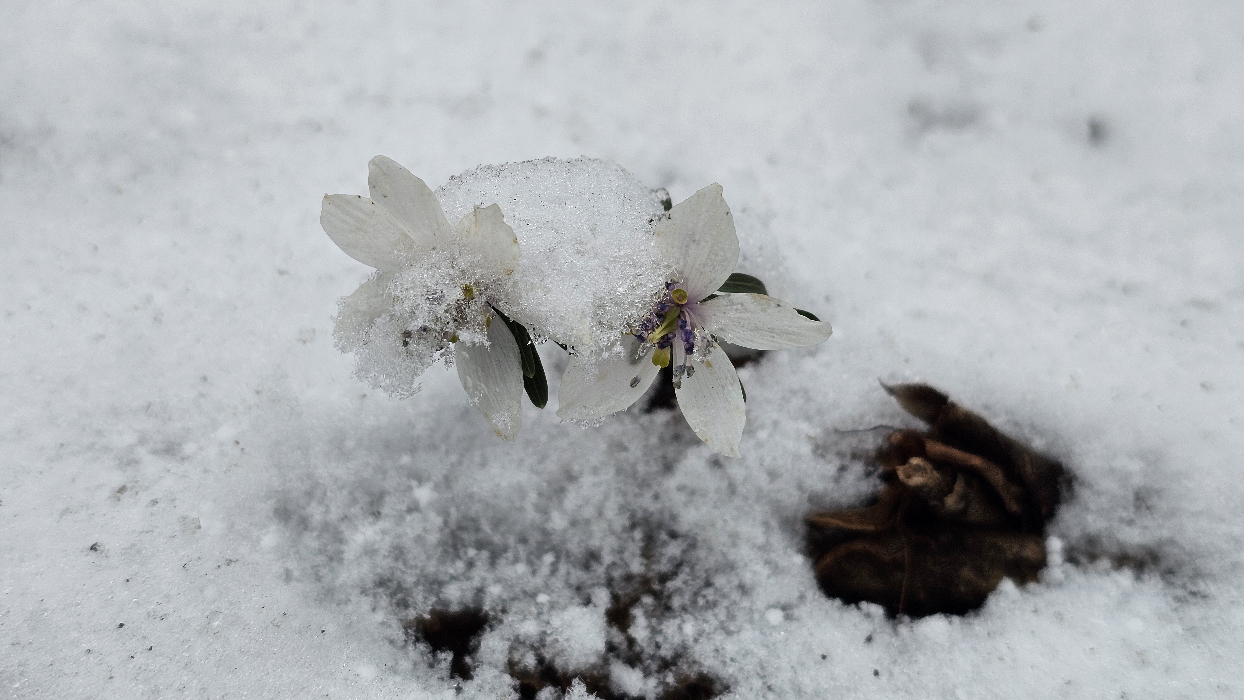 작은 돌 틈에 스며든 하얀 봄