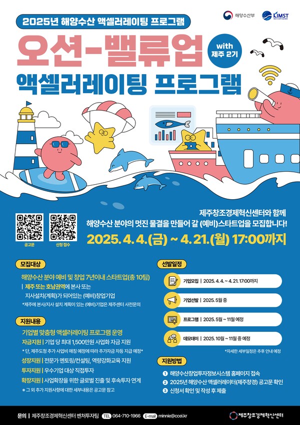 제주창조경제혁신센터(대표이사 이병선, 이하 제주센터)는 2025년 4월 4일부터 4월 21일 오후 5시까지 해양수산 분야의 예비창업자 및 창업 7년 이내 기업을 대상으로 '오션-밸류업 with jeju' 2기 참가기업 10개사를 모집한다고 밝혔다.