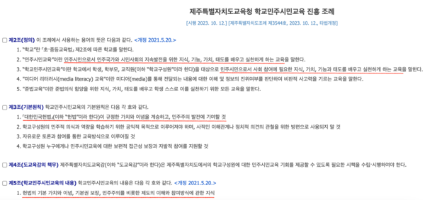 또, 조례는 학교민주시민교육의 내용 중 첫 번째 항목으로 “헌법의 기본 가치와 이념, 기본권 보장, 민주주의를 비롯한 제도의 이해와 참여방식에 관한 지식”을 들고 있다.
