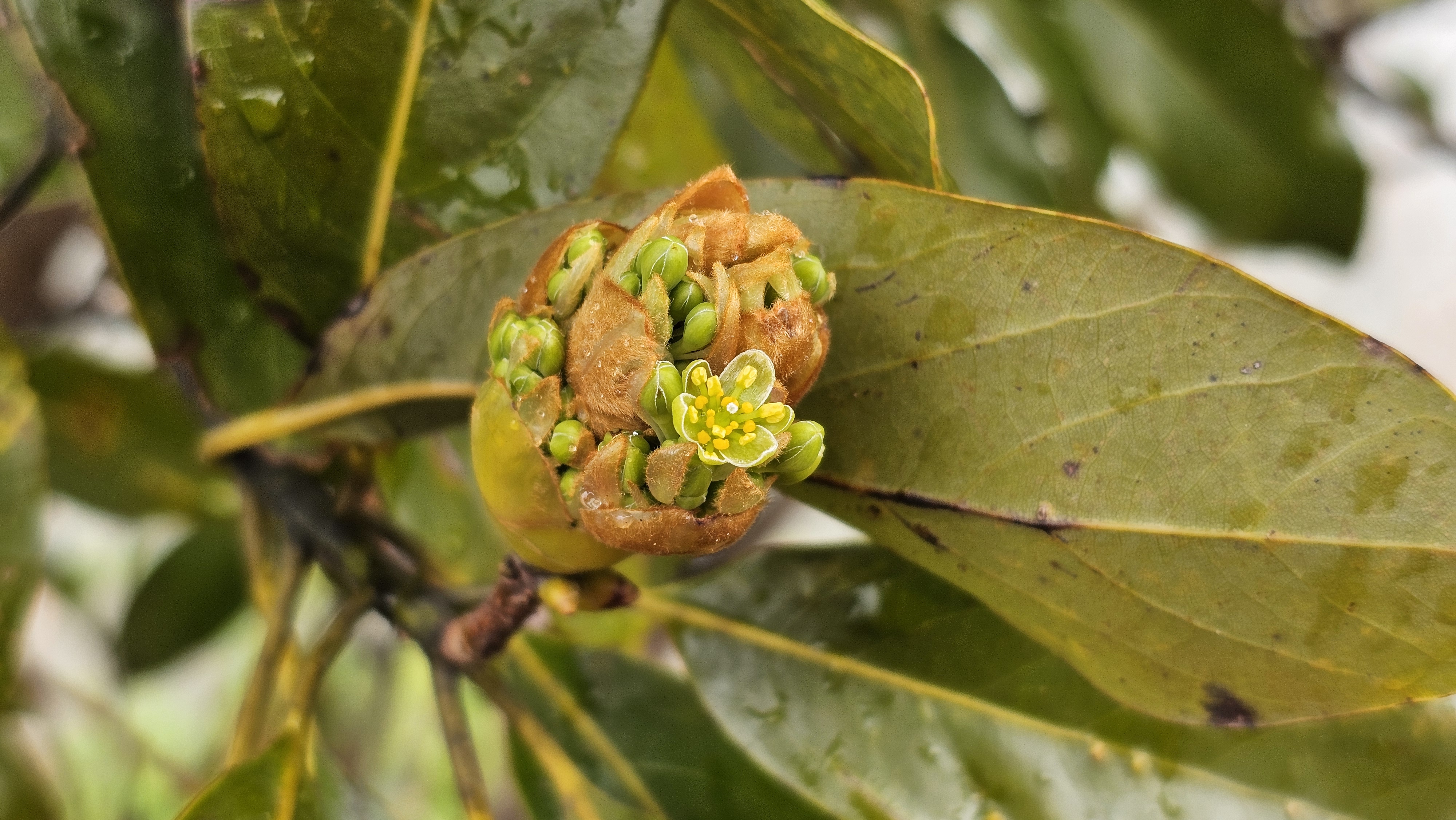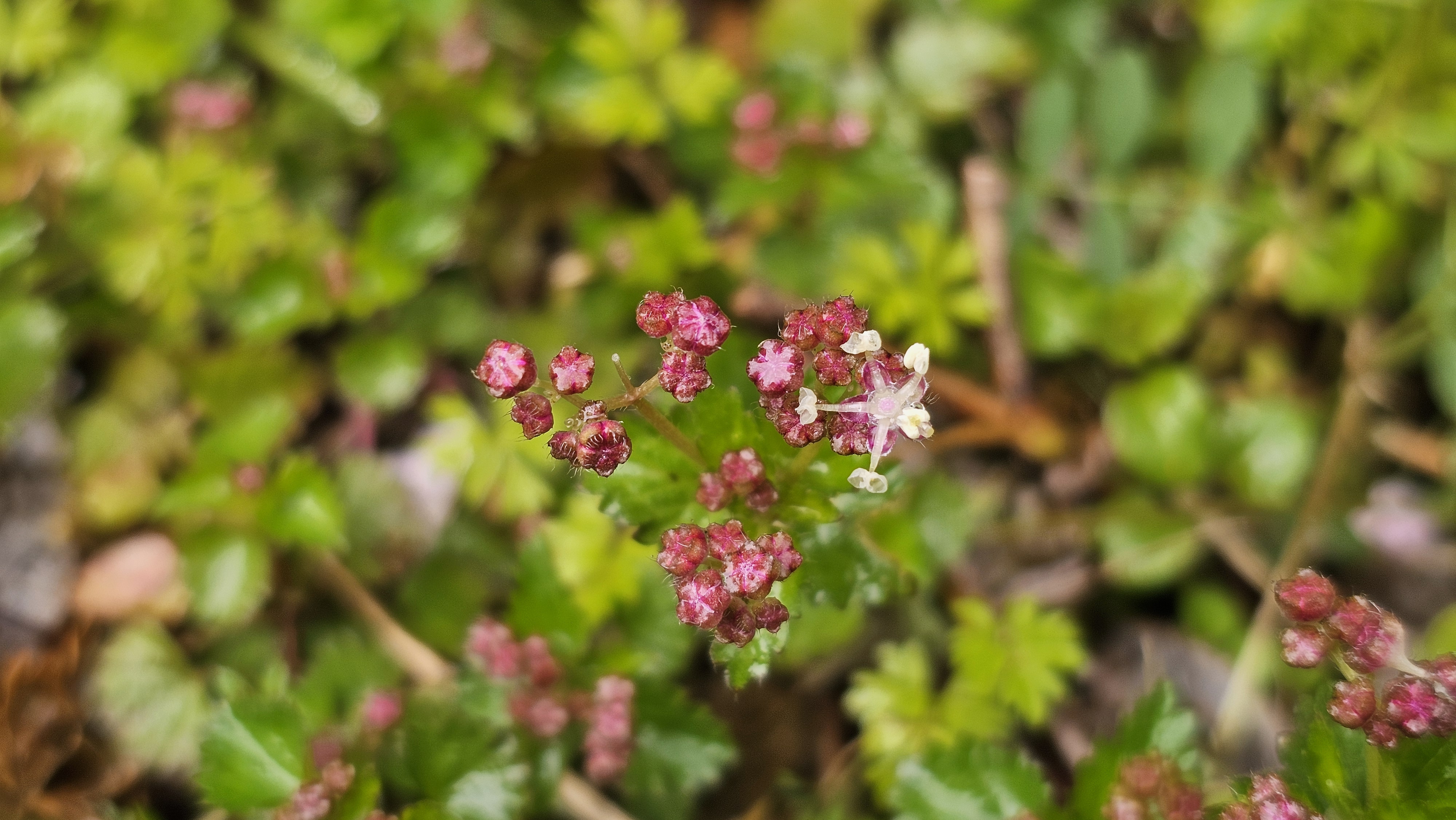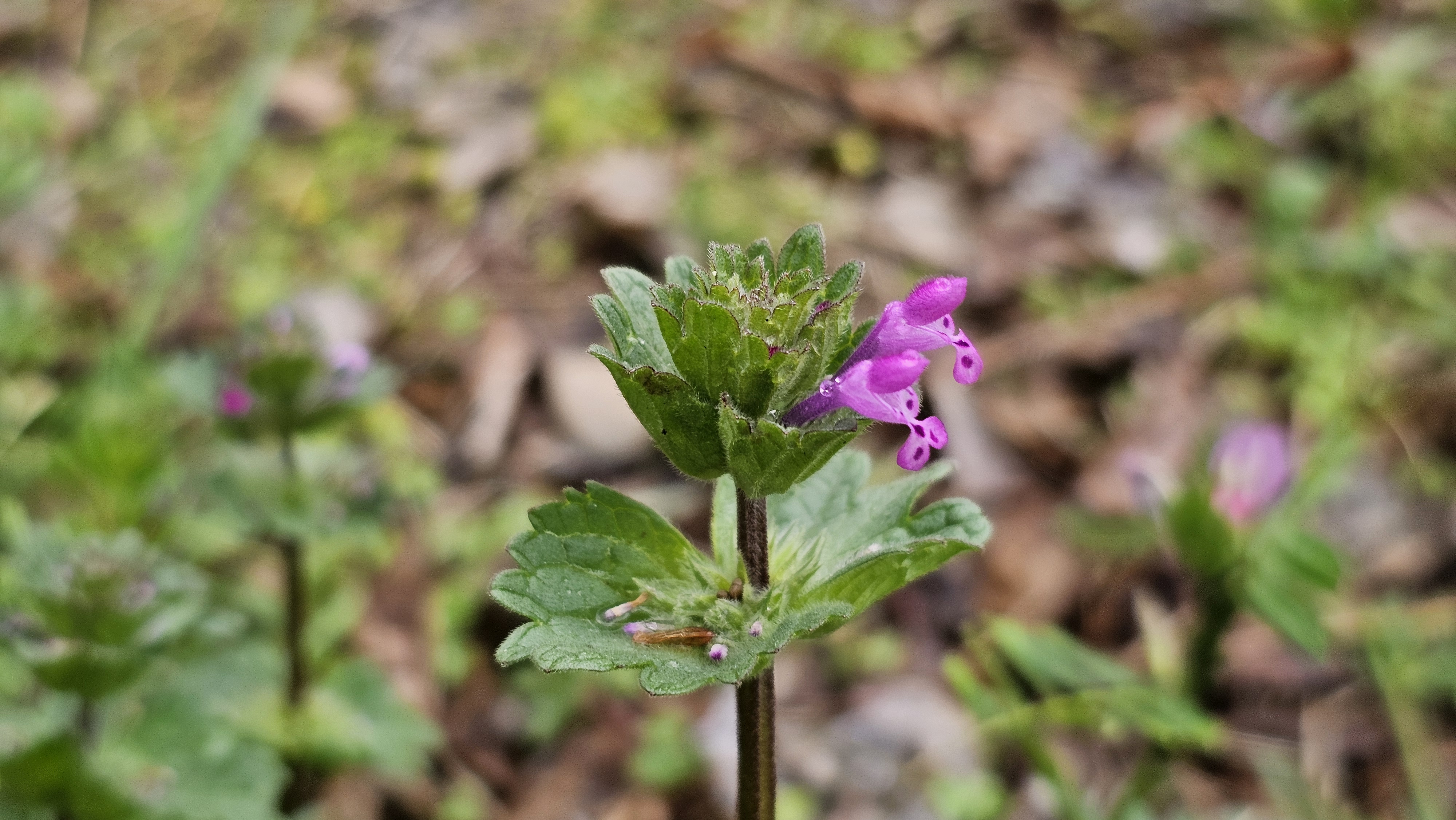 작은 꽃자루, 원통형의 꽃받침은 홍색으로 털이 보인다.
