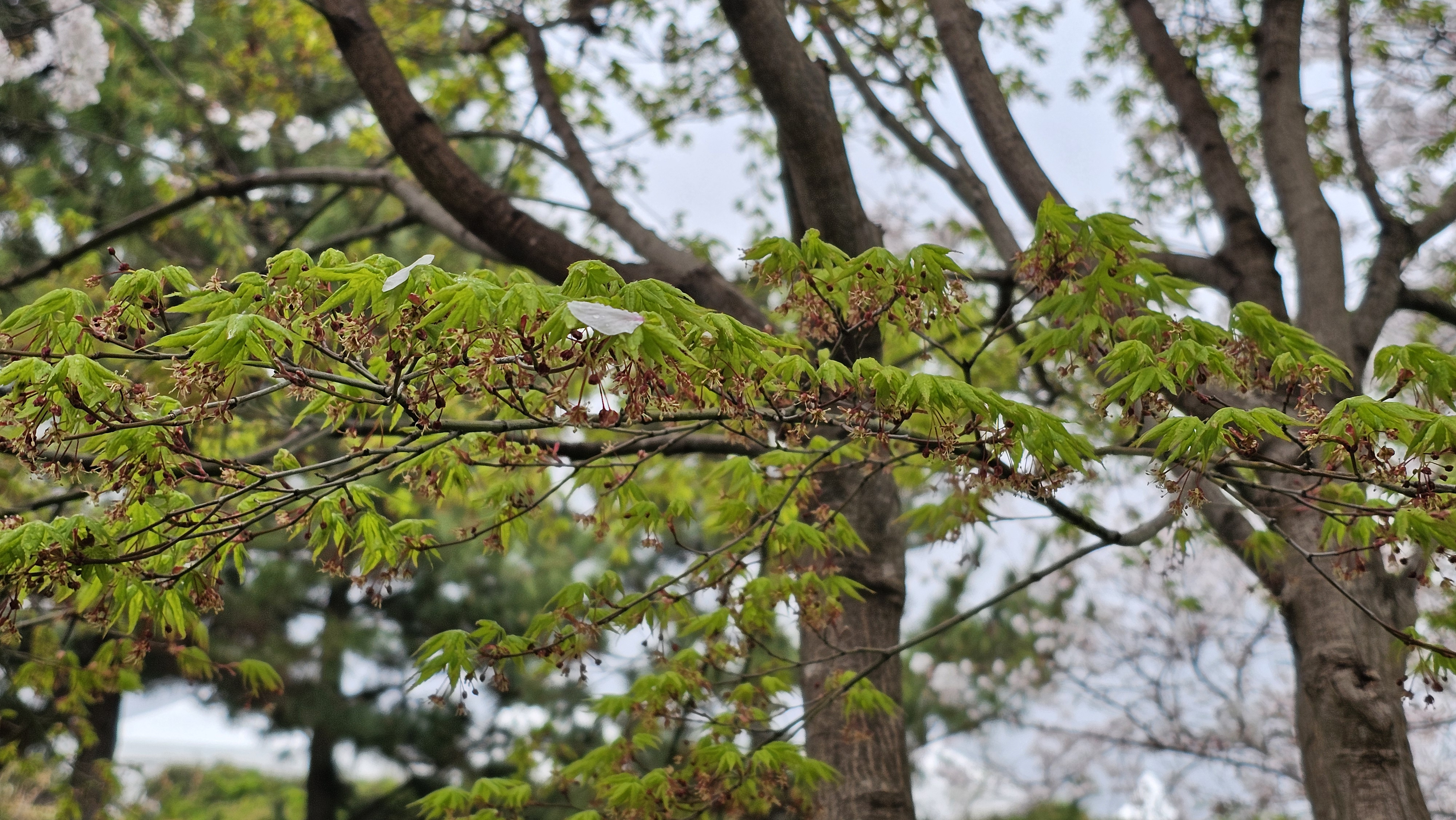 만개한 왕벚나무와 단풍나무 사이로 조명물이 제일 먼저 눈에 들어온다.