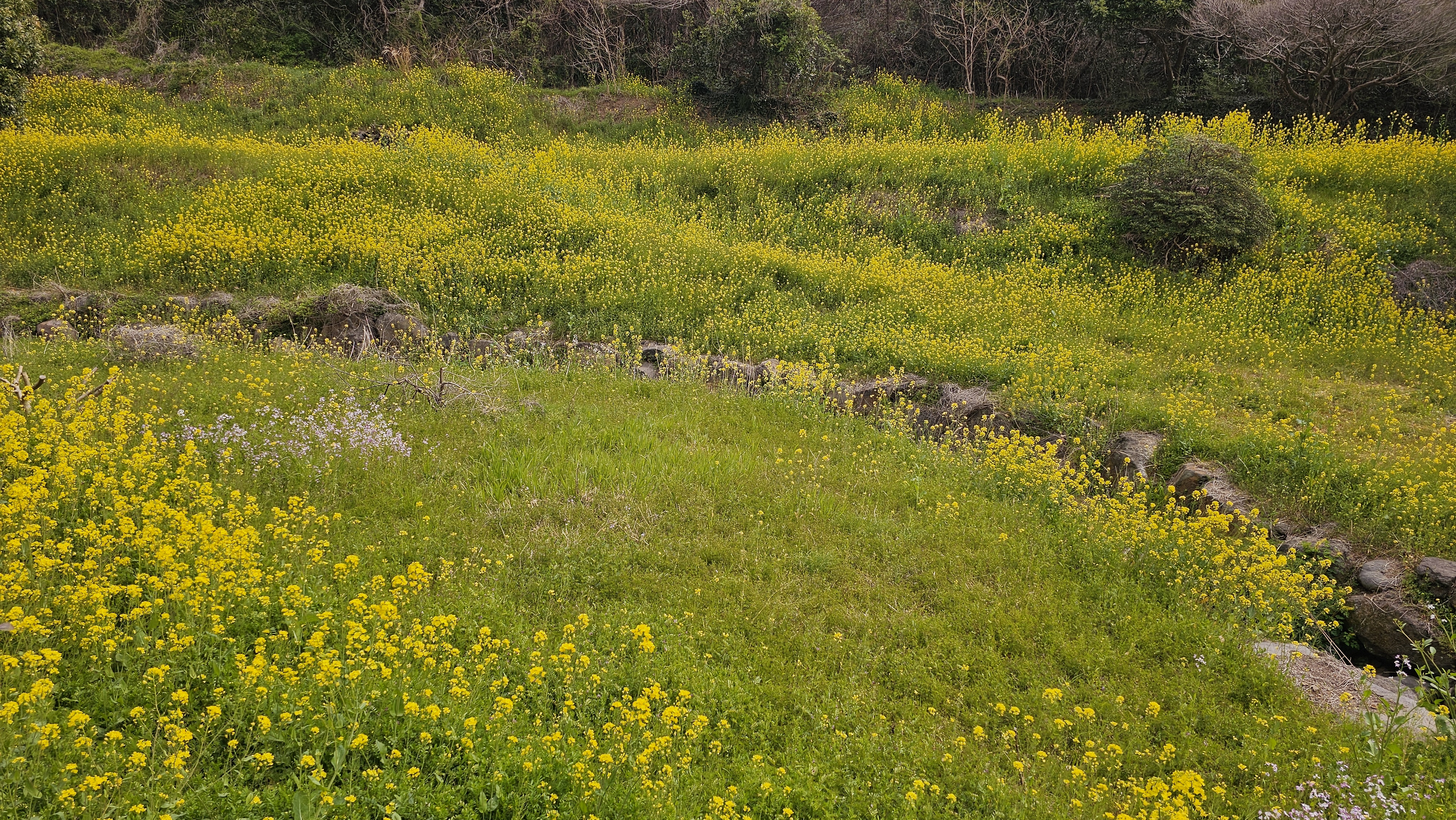 계곡 터에 자리 잡은 유채꽃동산 '엉덩물계곡'