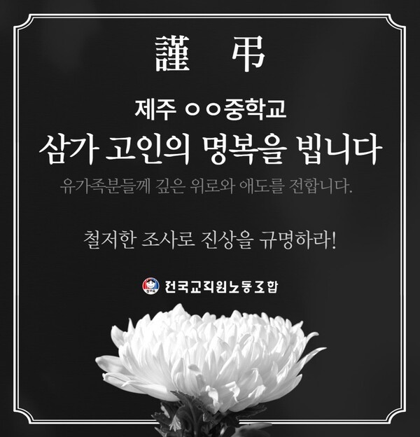 제주특별자치도교육청(교육감 김광수)이 오는 30일까지 유명을 달리한 도내 모 중학교 교사를 추모하는 분향소를 교육청 앞마당에 운영 중인 가운데, 교원단체에서는 23일부터 진실규명을 촉구하는 온라인 서명운동을 6월 3일까지 진행하고 있다.