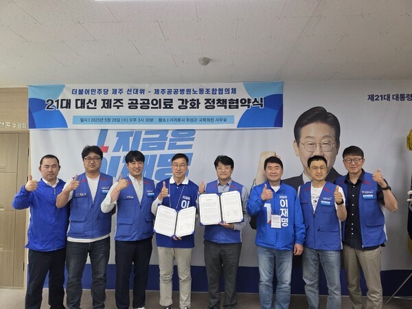 제주공공병원노동조합협의체와 이재명 제주선대위는 지난 29일 오후 서귀포선거연락소에서 정책협약식을 갖고 제주도민의 건강권 보장과 공공의료의 지속 가능한 발전에 협력할 것을 선언했다.