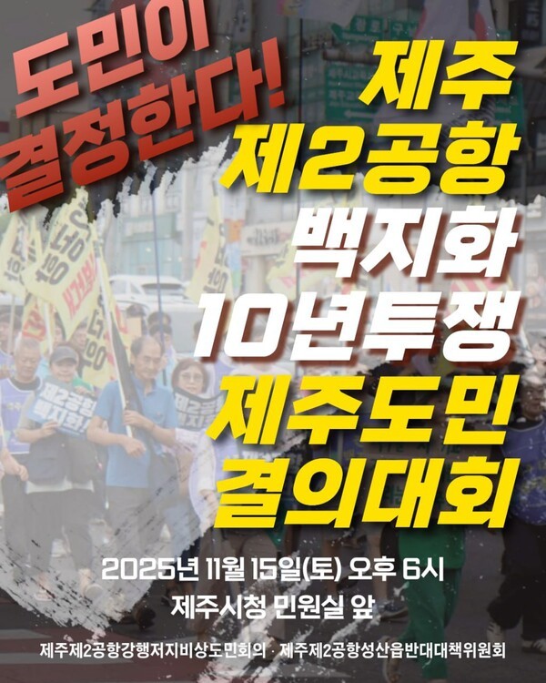 제2공항반대비상도민회의는 오는 15일(토) 오후 6시 제주시청 앞에서 제주2공항성산읍반대대책위원회와 공동으로 제2공항 백지화 10년 투쟁 제주도민결의대회를 개최할 예정이다.