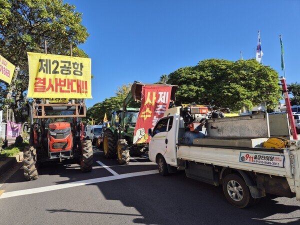 전국농민회총연맹 제주도연맹과 전국여성농민회총연합 제주도연합 10일 오전 서귀포시 성산읍 광치기해변에서 트랙터와 트럭 등 농사용 차량 70여 대를 동원해 오후 2시경까지 제주도청 앞까지 차량 시위를 이어갔다.