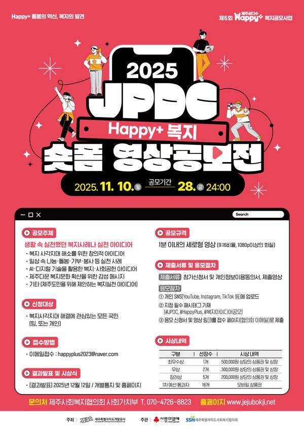 11월 10일부터 11월 28일까지 접수, 총상금 300만원 규모 □ 제주특별자치도사회복지협의회(회장 고승화)는 제주특별자치도개발공사(사장 백경훈)제주사회복지공동모금회(회장 강지언)와 함께 11월 10일부터 28일까지「2025년 JPDC Happy+복지 숏폼영상 공모전」을 개최한다고 밝혔다.